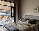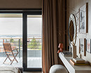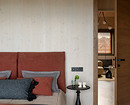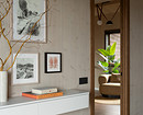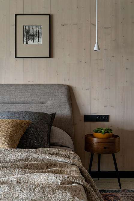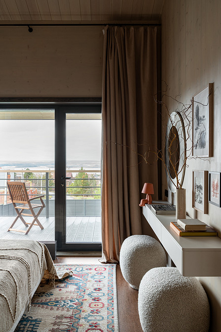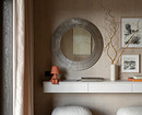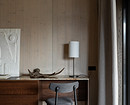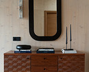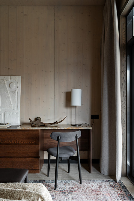 Например, в мастер-спальне комод из дерева объединен со столиком из натурального камня, в спальне на втором этаже — длинная консоль, выполняющая роль и туалетного столика, и хранения.