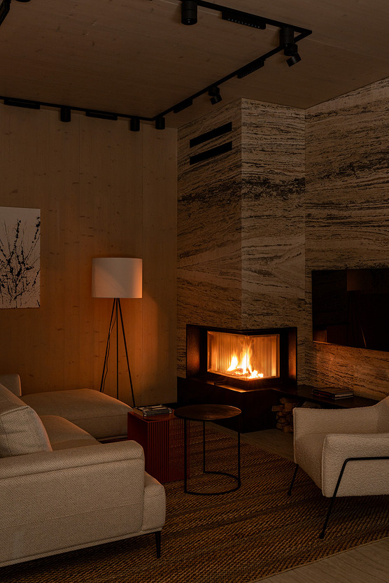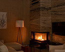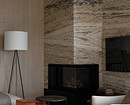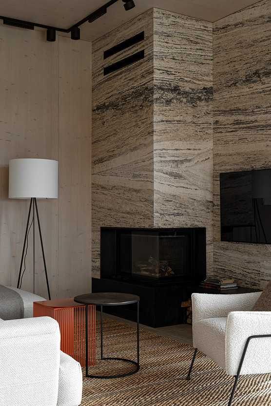 Акценты в интерьере создали с помощью натуральных материалов и фактур. В гостиной камин и ТВ-зону оформили травертином.