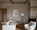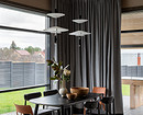 Потолочное освещение спроектировали с помощью накладных точечных и трековых светильников черного цвета, контрастного к цвету деревянного потолка.
