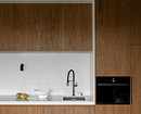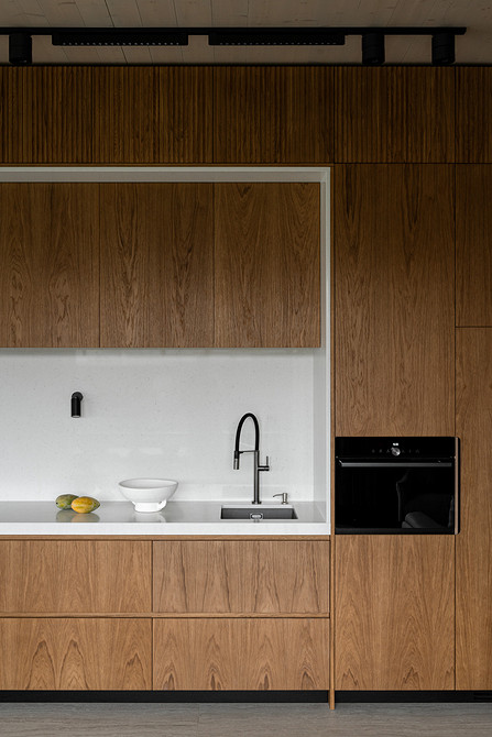 Кухонный гарнитур выполнили в деревянном шпоне с белой столешницей и фартуком из кварцевого агломерата. В колонны встроены холодильник и духовой шкаф, рядом с панорамным окном сделали барную стойку для быстрых перекусов.