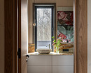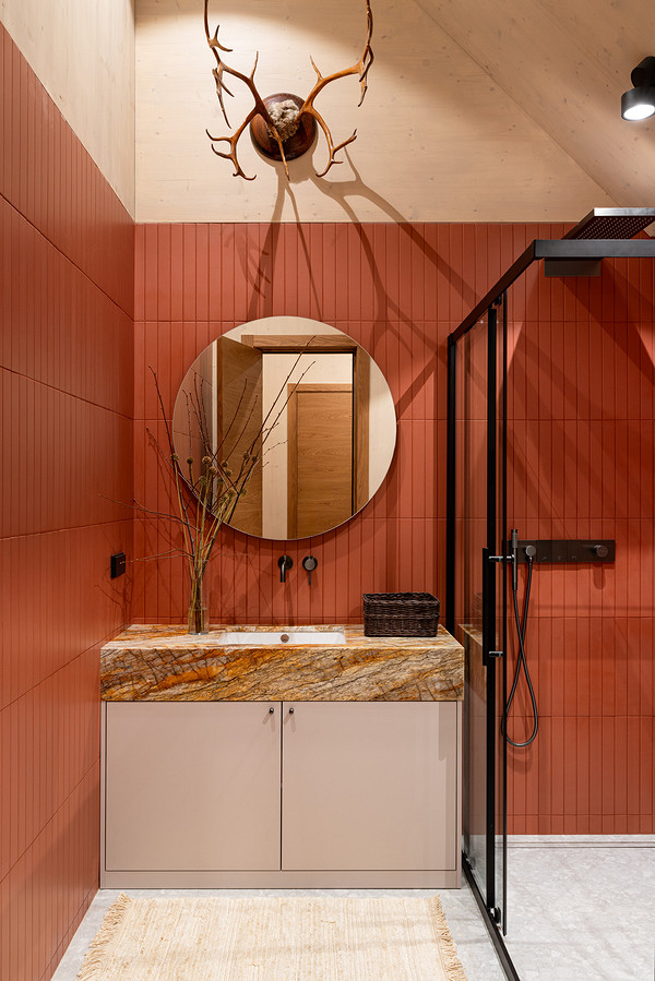 В ванной комнате на втором этаже решили сделать яркую отделку: мелкоформатная плитка насыщенного терракотового цвета сочетается с нейтральной отделкой пола из керамогранита под терраццо и такой же столешницей из камня, как и в мастер-ванной.