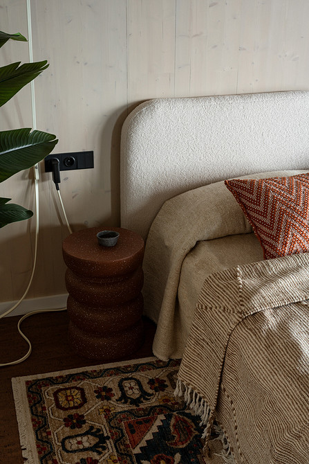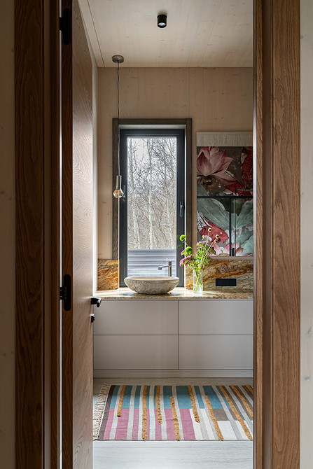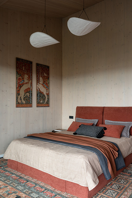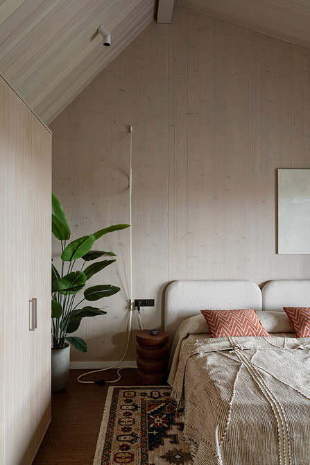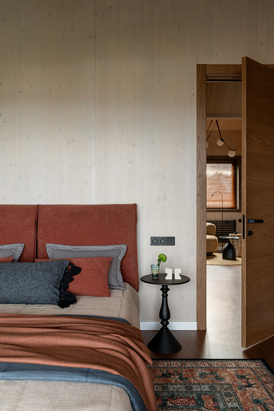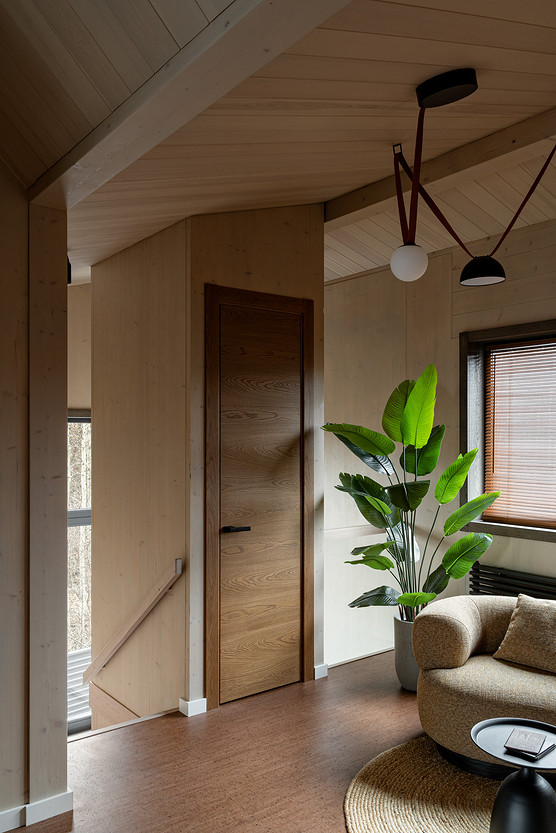 Дом построен из CLT-панелей — это многослойные панели из дерева. Они стали основой и в интерьере, так как не требуют финишной отделки. На пол первого этажа уложили плитку, на втором — пробковое покрытие.