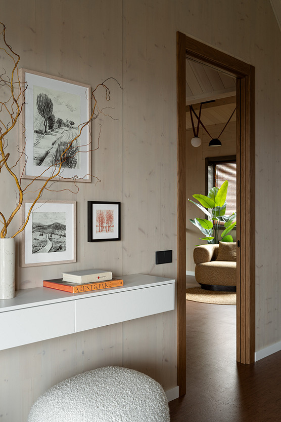 Семья с двумя детьми построила дом в деревне на берегу реки. К дизайнеру Алене Ольхиной они обратились с запросом на оформление современного уютного интерьера с продуманным хранением и натуральными материалами в отделке. Семья ведет активный образ жизни, катается на лыжах, но при этом в своем доме хотели бы ощущения спокойствия и размеренности.