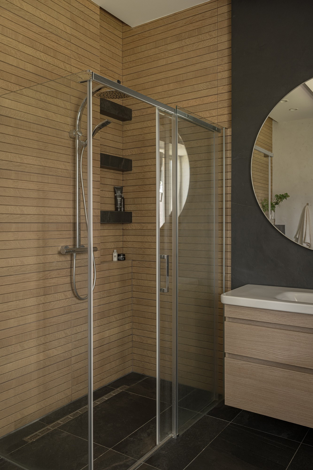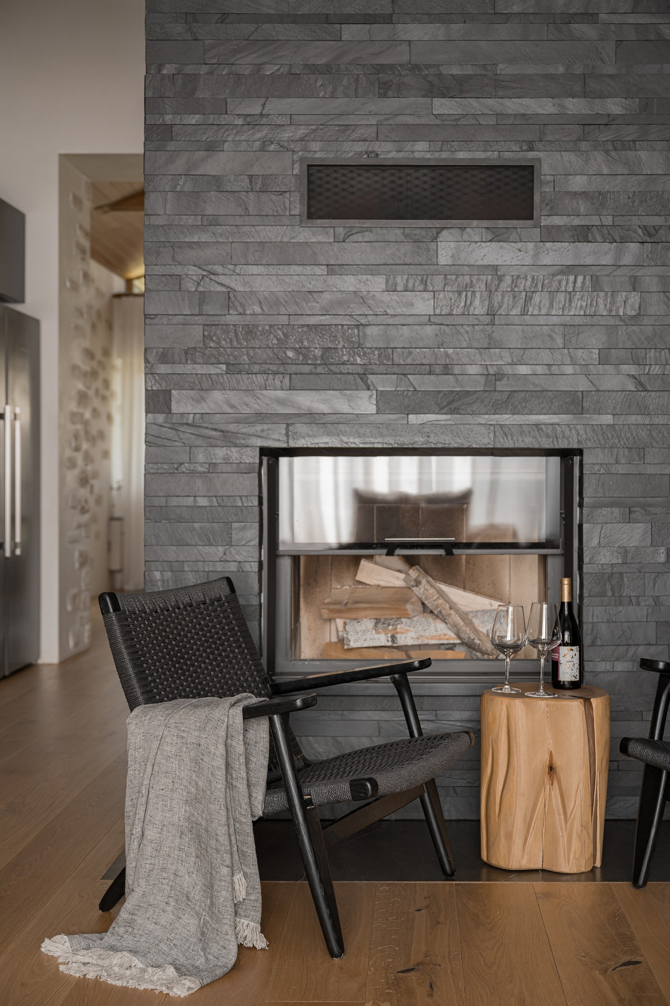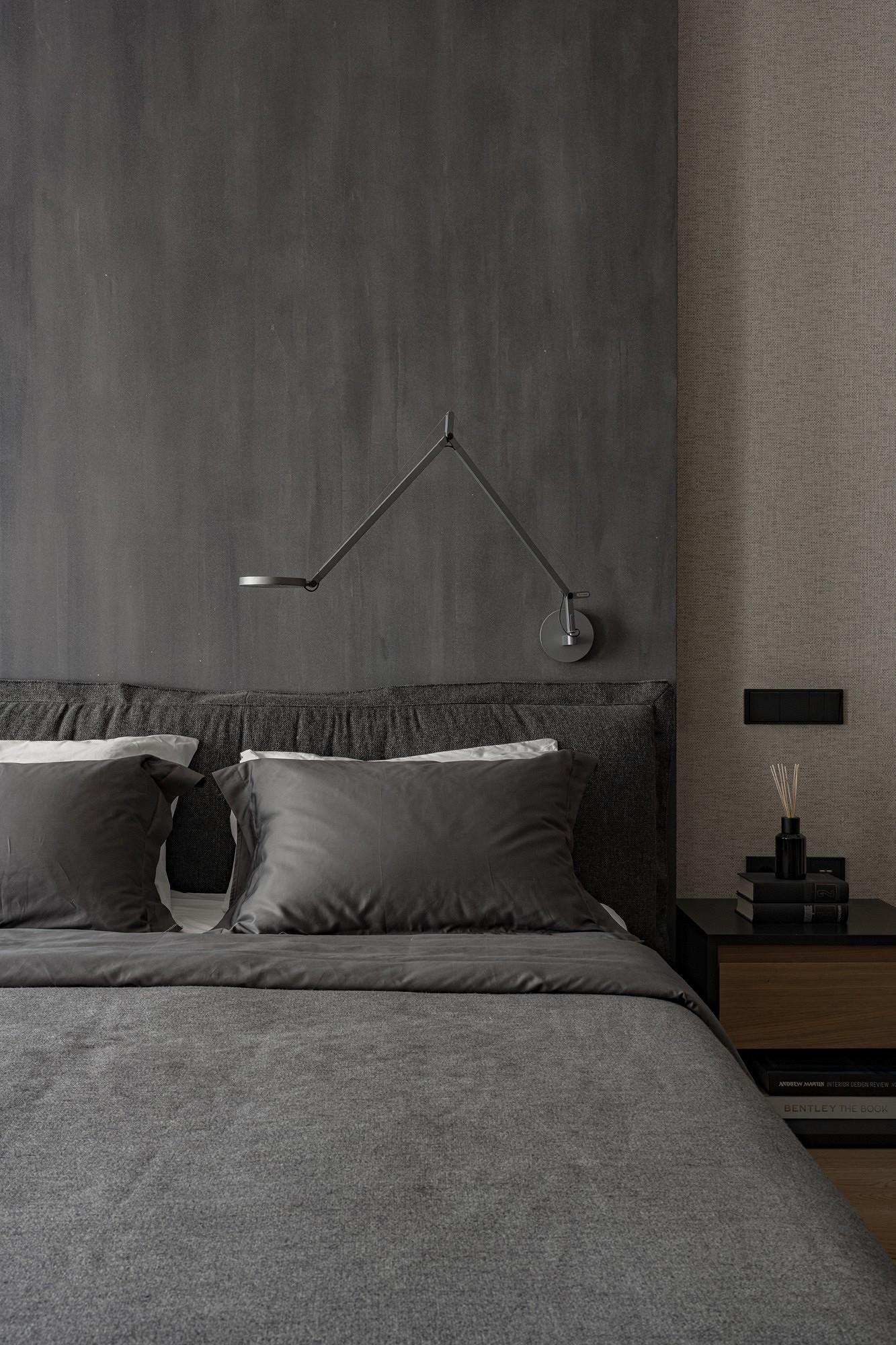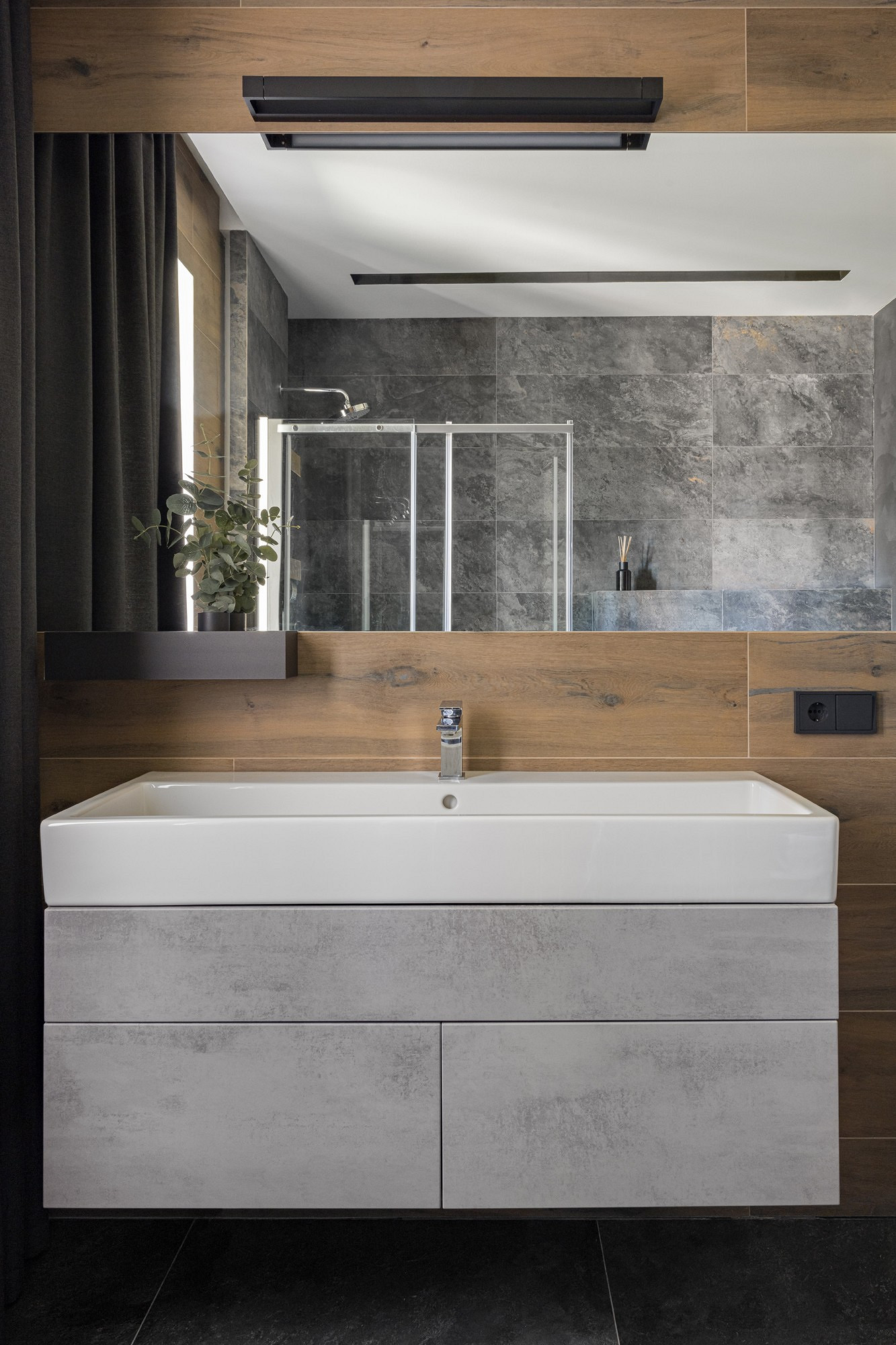 Свои пожелания относительно оформления интерьеров клиенты сформулировали следующим образом: обилие натураль ного дерева, натуральных текстур и монохромная гамма. Концепция звучала лаконично, однако созданные на ее основе интерьеры в современной эстетике с элементами шале привлекают брутальной, но теплой, сильной и очень чувственной красотой.