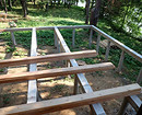При свайном фундаменте несущая конструкция настила, в принципе, может состоять только из антисептированных деревянных балок. Выпуски свай отпиливают по меткам, сделанным с помощью лазерного или водяного нивелира, благодаря чему балки «автоматически» располагаются на одном уровне (хотя при наличии дефектов распиловки их приходится остругивать по верхней пласти). Минус в том, что шаг балок (а значит, и рядов свай) не должен превышать 1 м, иначе настил будет прогибаться под нагрузкой. Уменьшить число свай помогает конструкция, в которой поверх балок располагают лаги — доски сечением 50 × 100 мм или более, поставленные на ребро на расстоянии 50-70 см друг от друга. Очень прочную и долговечную террасу можно построить, сочетая со сваями балки из металлопроката (например, двутавра 16) и лаги из лиственничных досок.