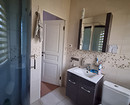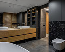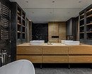 В ванной комнате — хозяйственный шкаф со стиральной и сушильной машинами, а также объемное хранение в тумбе, которая заняла всю стену.
