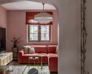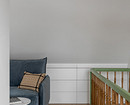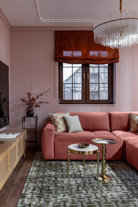 В гостиной поставили большой угловой диван персикового цвета, тумбу под телевизор с дверками из фрезерованной фанеры. Деревянные рейки отделили гостиную от входной зоны.