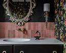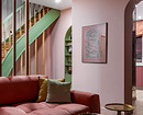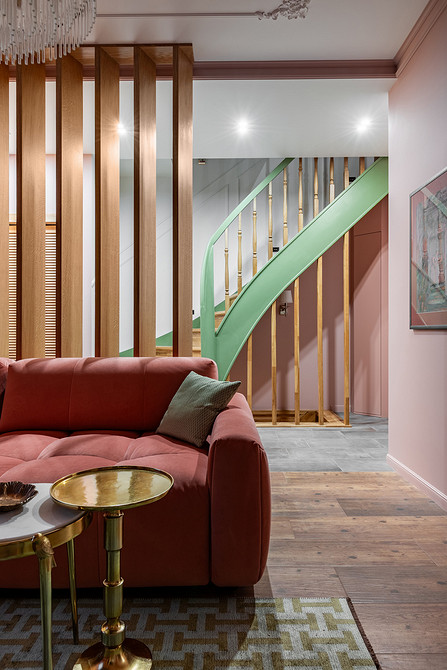 Цвета выбраны сложные, порой припыленные, необычные и смелые. Цокольный этаж — более томная гамма: темно-лазурные стены и рыжий кожаный диван в комнате отдыха, в ванной и душевой — сочетание текстуры бетона и черного мрамора. Первый этаж — нестандартный микс оттенков: стены в цвете чайной розы, сложный цвет аспарагуса на лестнице и стеллаже, гранатовая кухня, текстиль в кирпичном цвете, персиковый диван. Баланса этому сочетанию добавляет мебель из натурального дерева и светлая столешница из гранита с рисунком. На веранде нанесена белая фактурная декоративная штукатурка, а акцентов добавляет яркая мебель. На втором этаже — спальня с готическими элементами, черно-белый интерьер с ярким креслом и текстилем в цветах махагон и марсала. Стены в гостевой выполнены в кофейном оттенке, белая мебель и диван лососевого цвета. Санузел яркий: акцентные обои в цветочном принте, стены в цвете антрацит, сочетание латуни и серебра в декоре и сантехнике. На мансарде спокойные тона: белый тон стен, мебель из дерева и в серых тонах.
