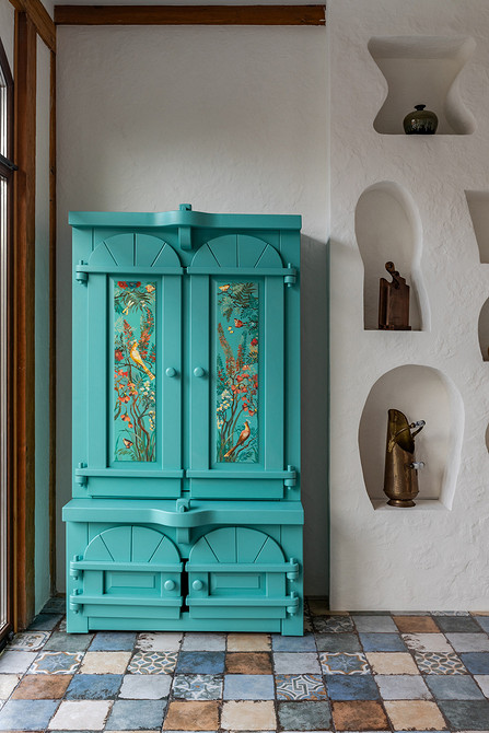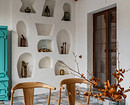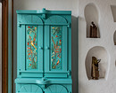 На террасе организовали место для отдыха, сделали стену с нишами под декор и поставили отреставрированный винтажный шкаф бирюзового цвета.