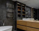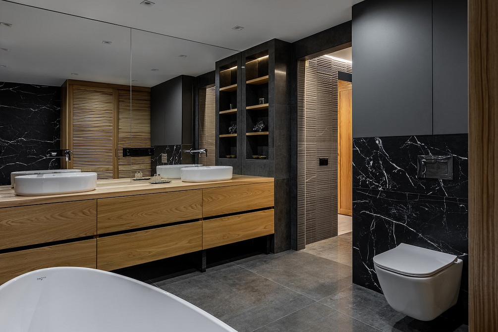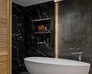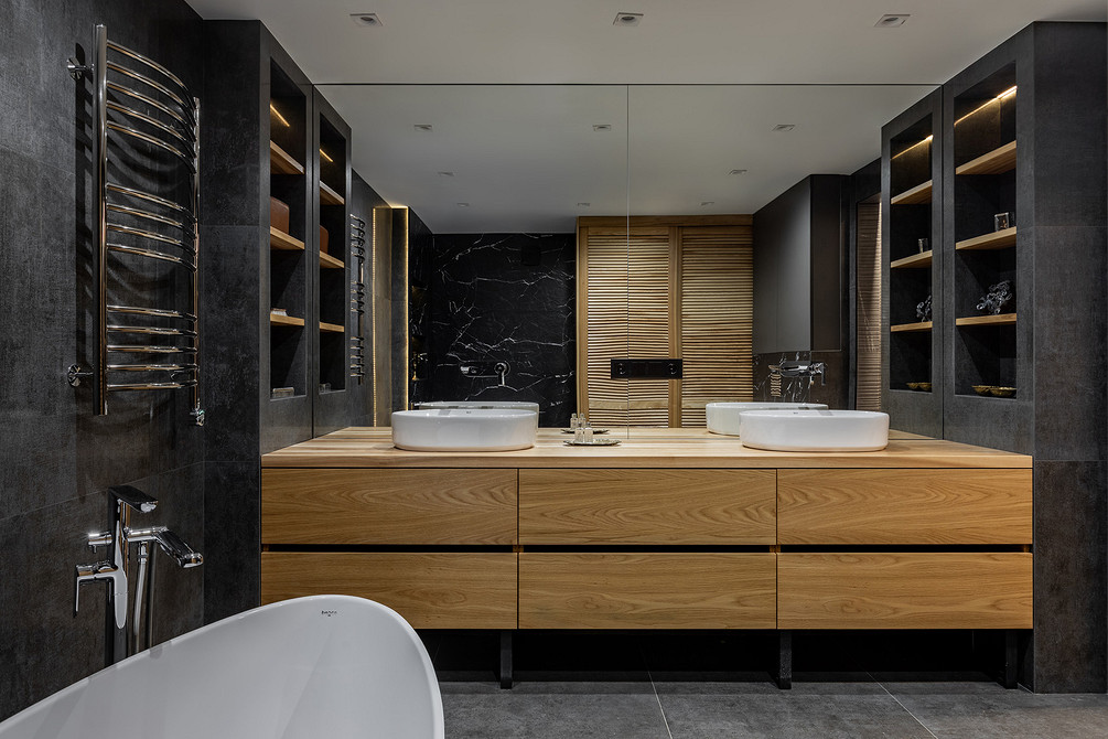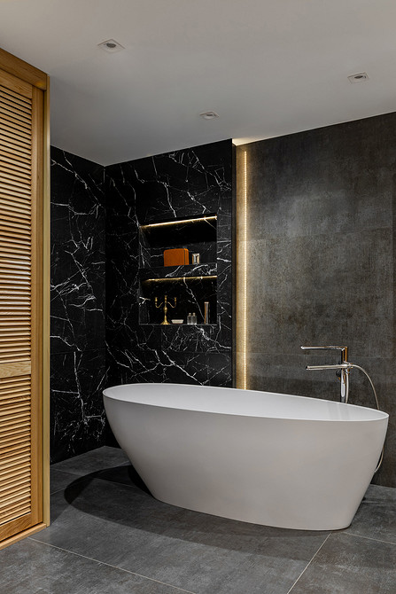 Хранение организовано и во встроенных полочках по бокам от тумбы. Также полки-ниши организовали над чашей ванны.