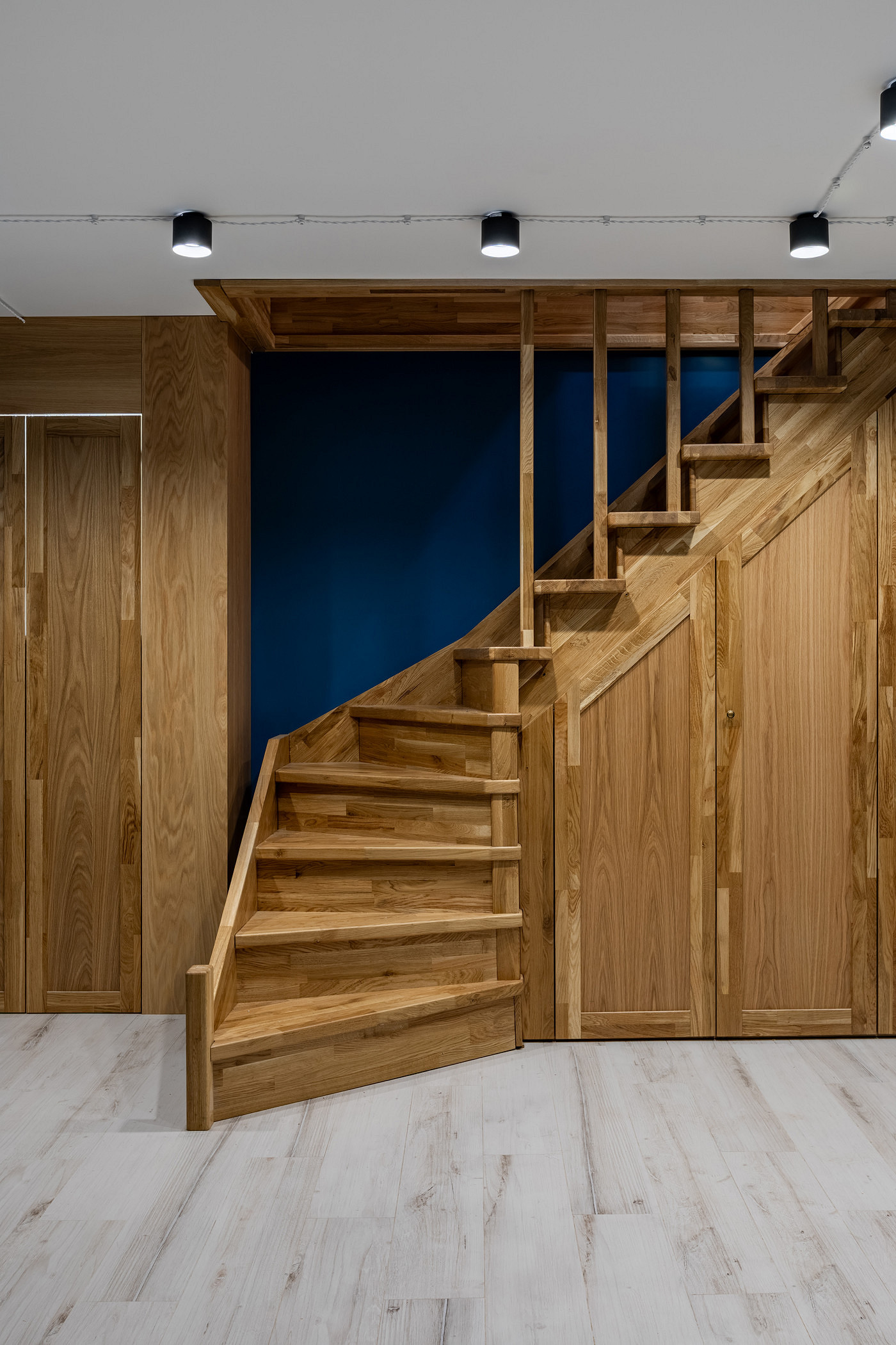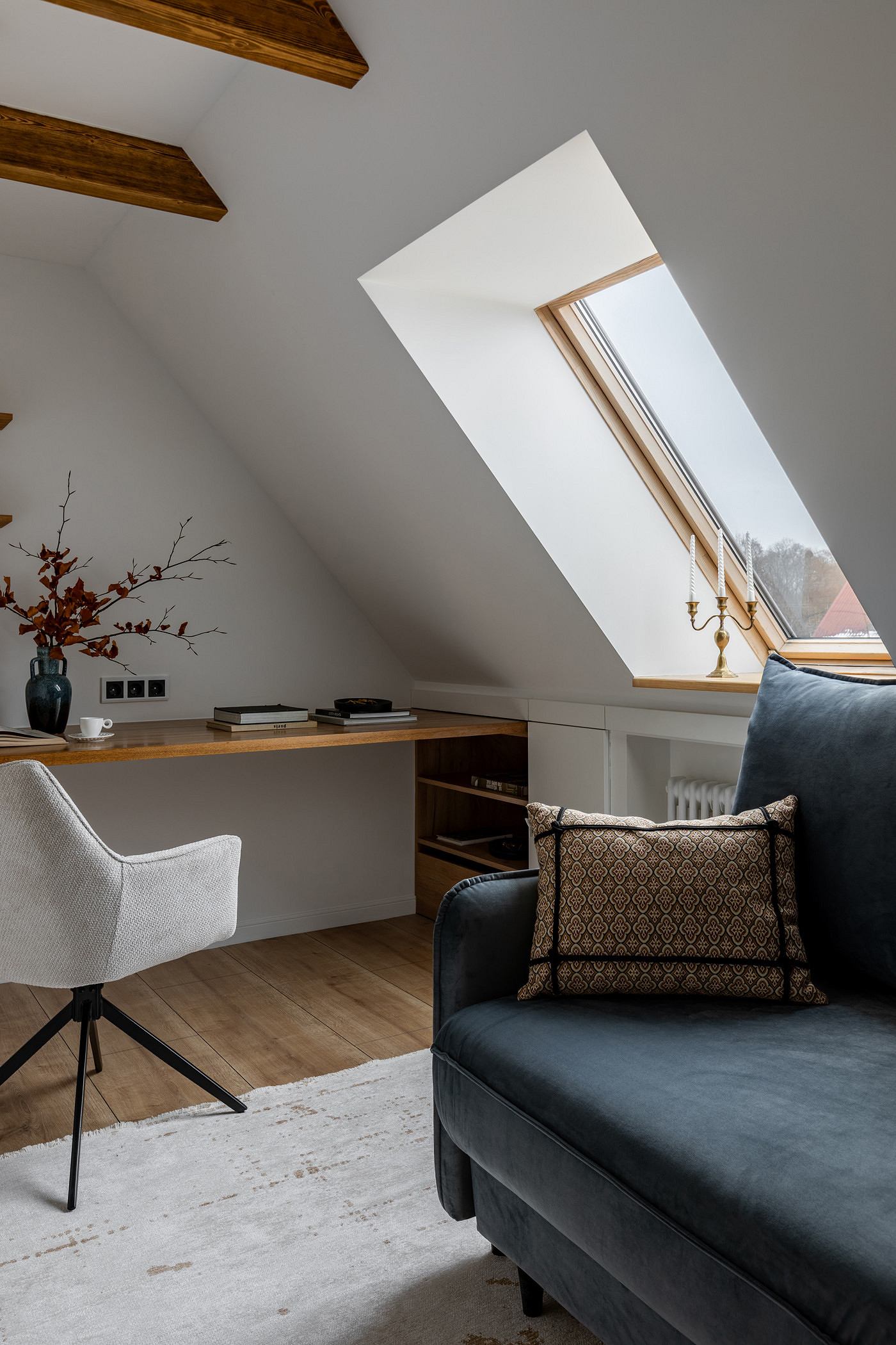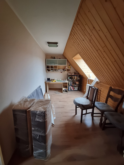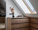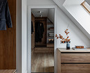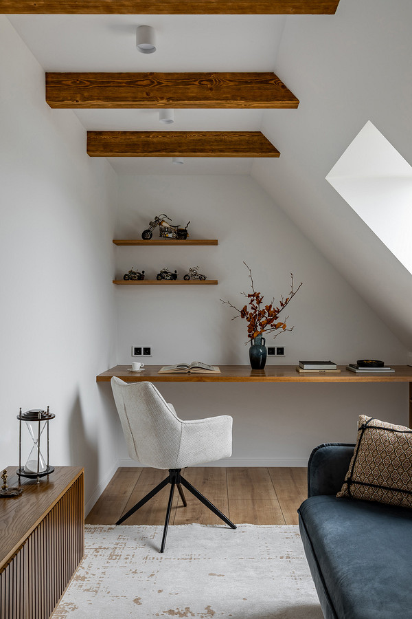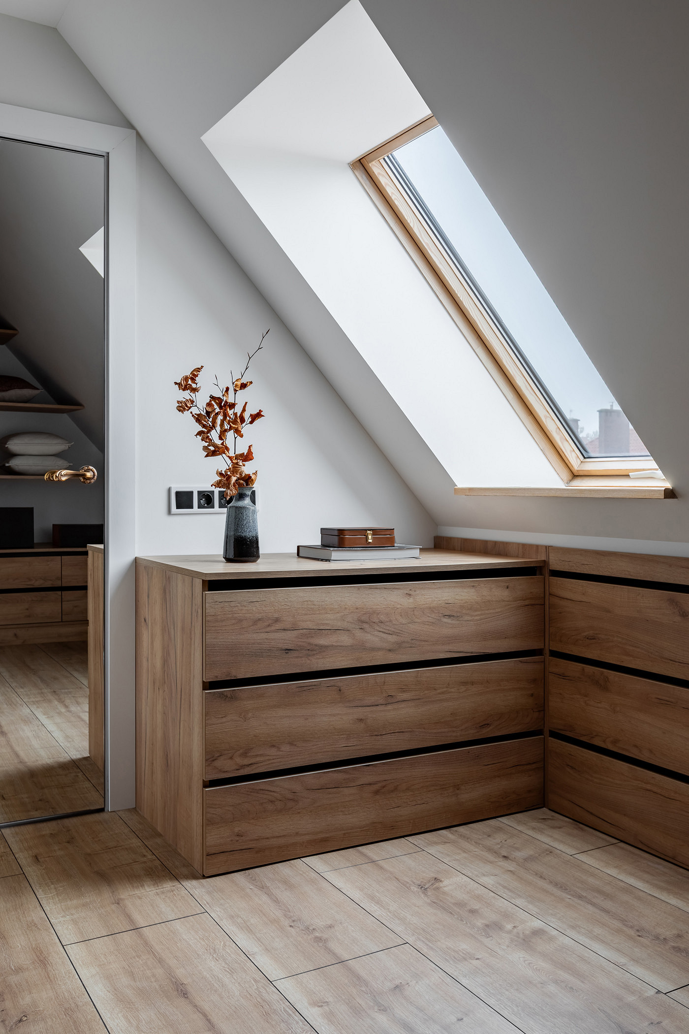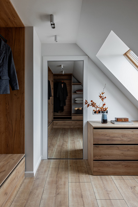 Под скатом крыши после демонтажа остались ниши, которые задействовали под хранение: сделали выдвижные ящики и в кабинете, и в гардеробной.