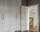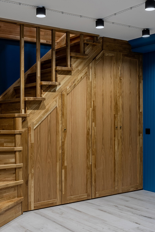 При входе у двери — встроенный шкаф для верхней одежды и обуви. Напротив входа встроили стеллаж арочной формы для книг и декора.