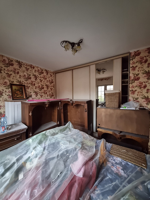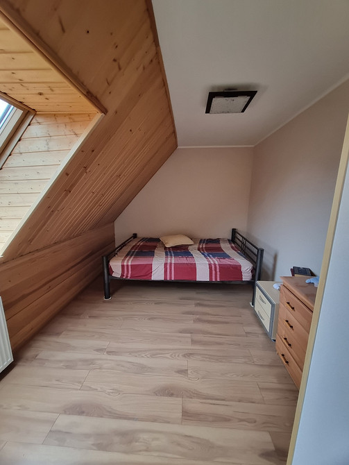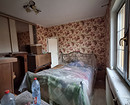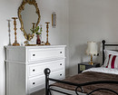 В спальне — большая кровать, кресло и комод.