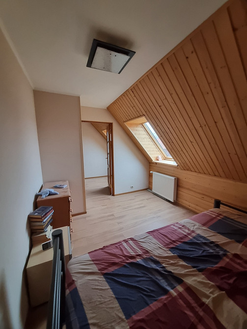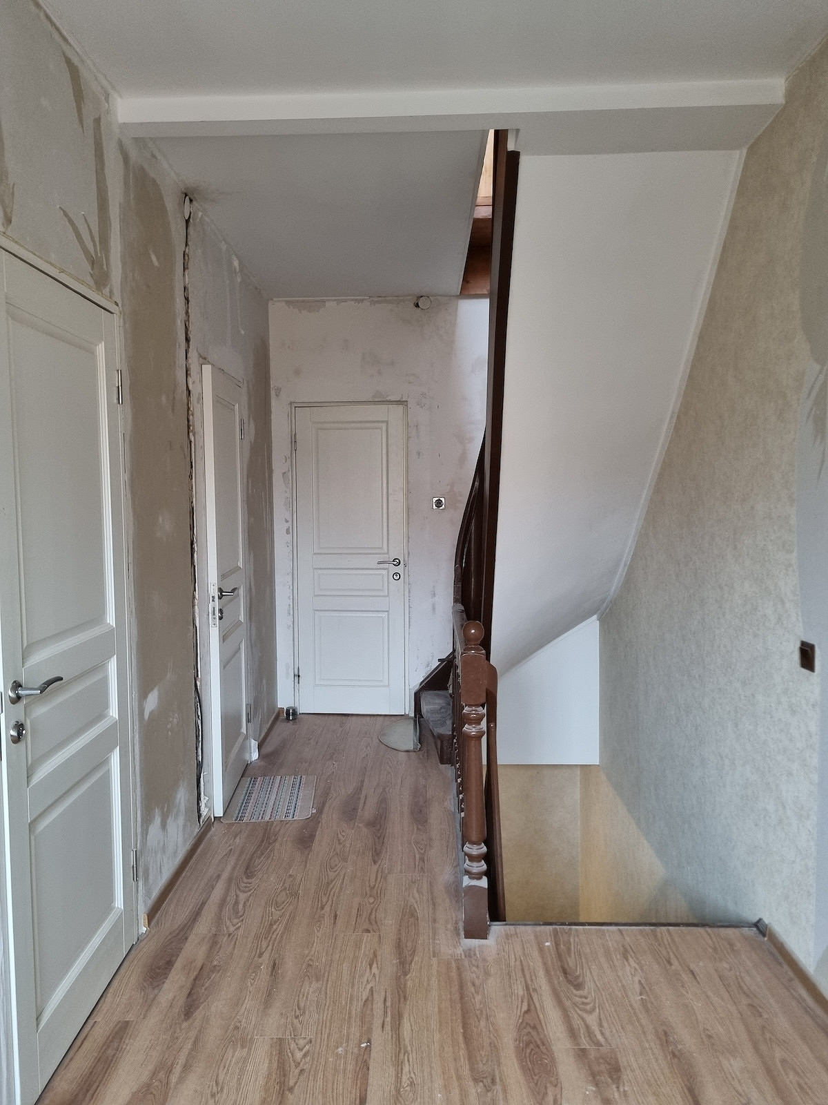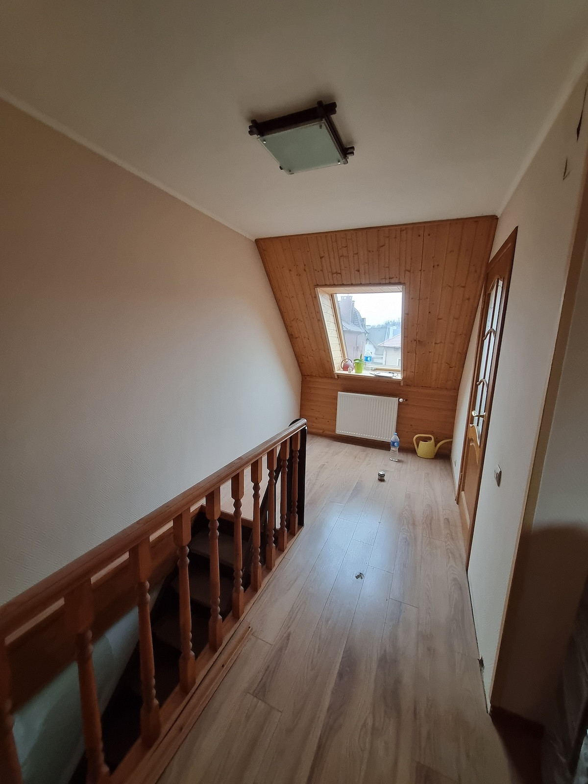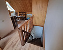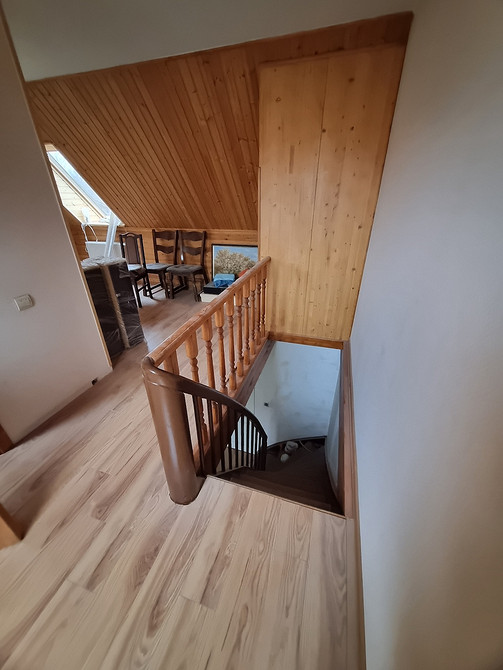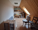 На пол третьего мансардного этажа уложили ламинат. Потолки везде сделали из гипсокартона и покрасили.