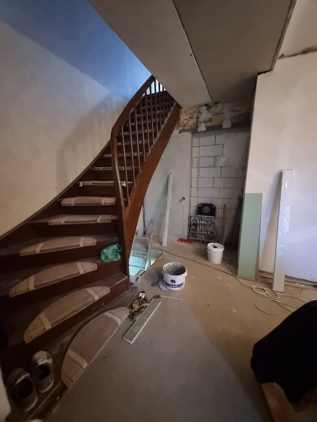 На цокольном этаже создана зона отдыха с диваном и отреставрированным шкафом для хранения. Под лестницей спрятаны газовый котел, водонагреватель.