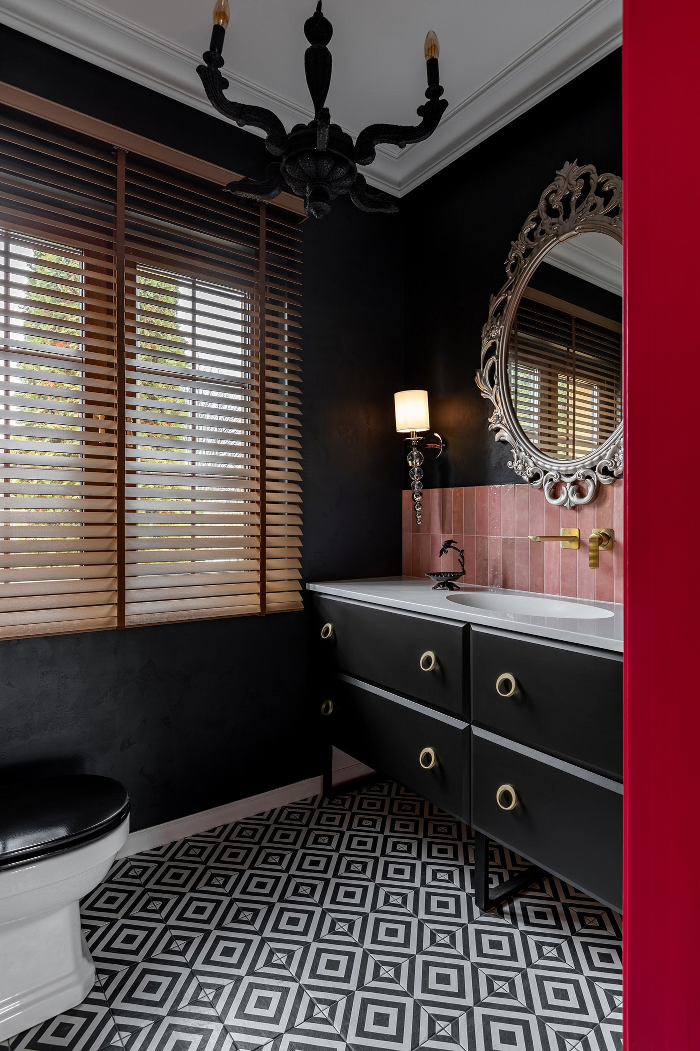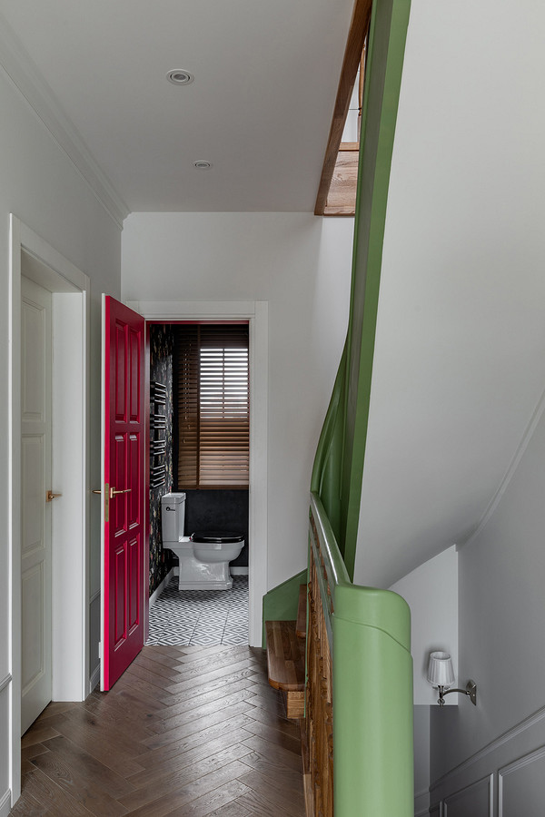 На втором этаже уложили паркет «елочкой». В санузле — напольная плитка с геометрическим рисунком, темная штукатурка на стенах и акцентные обои с цветочным рисунком на черном фоне на стене напротив окна.