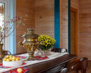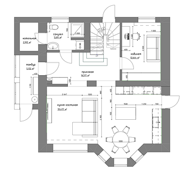 На первом этаже — большая кухня-гостиная, кабинет, санузел со входом с котельную. Вход в дом предваряет тамбур. На втором этаже — две спальни, кабинет и просторная ванная комната. Дизайнер не меняла расположение и назначение комнат, а постаралась создать функциональную планировку с помощью расстановки мебели.