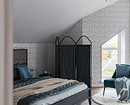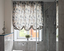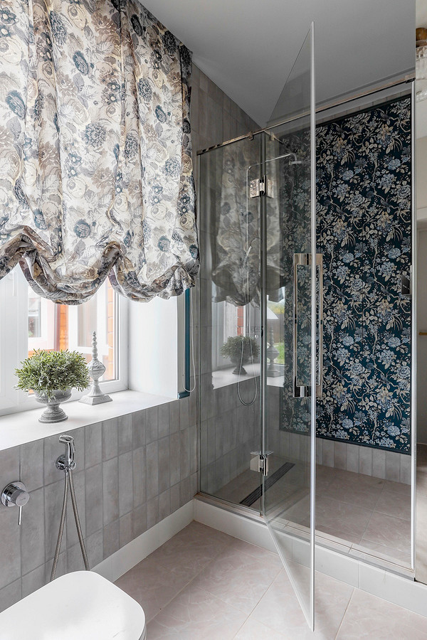В ванной комнате на втором этаже встроен шкаф. Фасады шкафа декорированы обоями-фреской с рисунком, который по цвету повторяет рисунок напольной плитки.