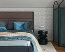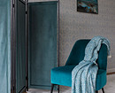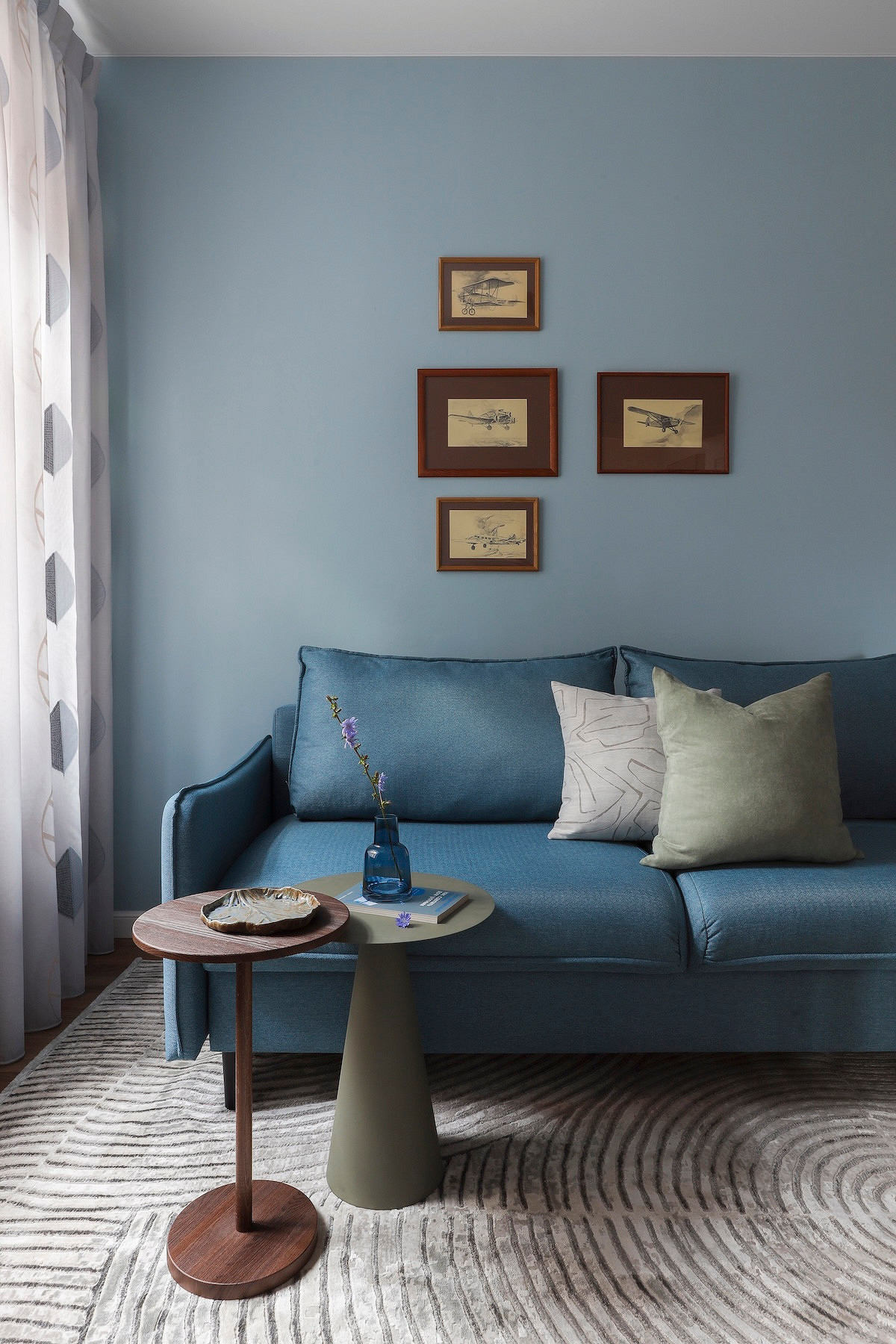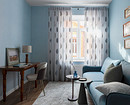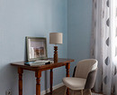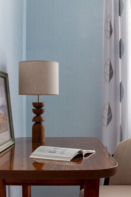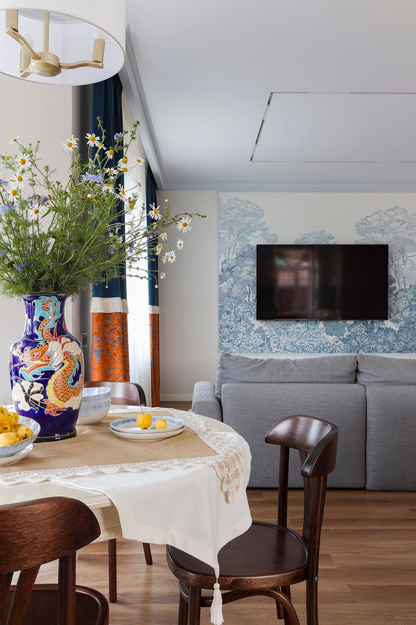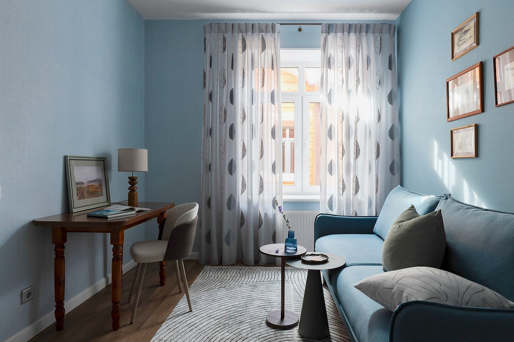 Основная отделка стен — краска. В прихожей и кухне-гостиной использовали светлые оттенки краски, в кабинете — голубой цвет. В качестве акцента в общей зоне применили декоративные фрески — на стене с телевизором и над открытой полкой кухни. В спальне поклеили обои, которые добавили уюта и атмосферы помещению.