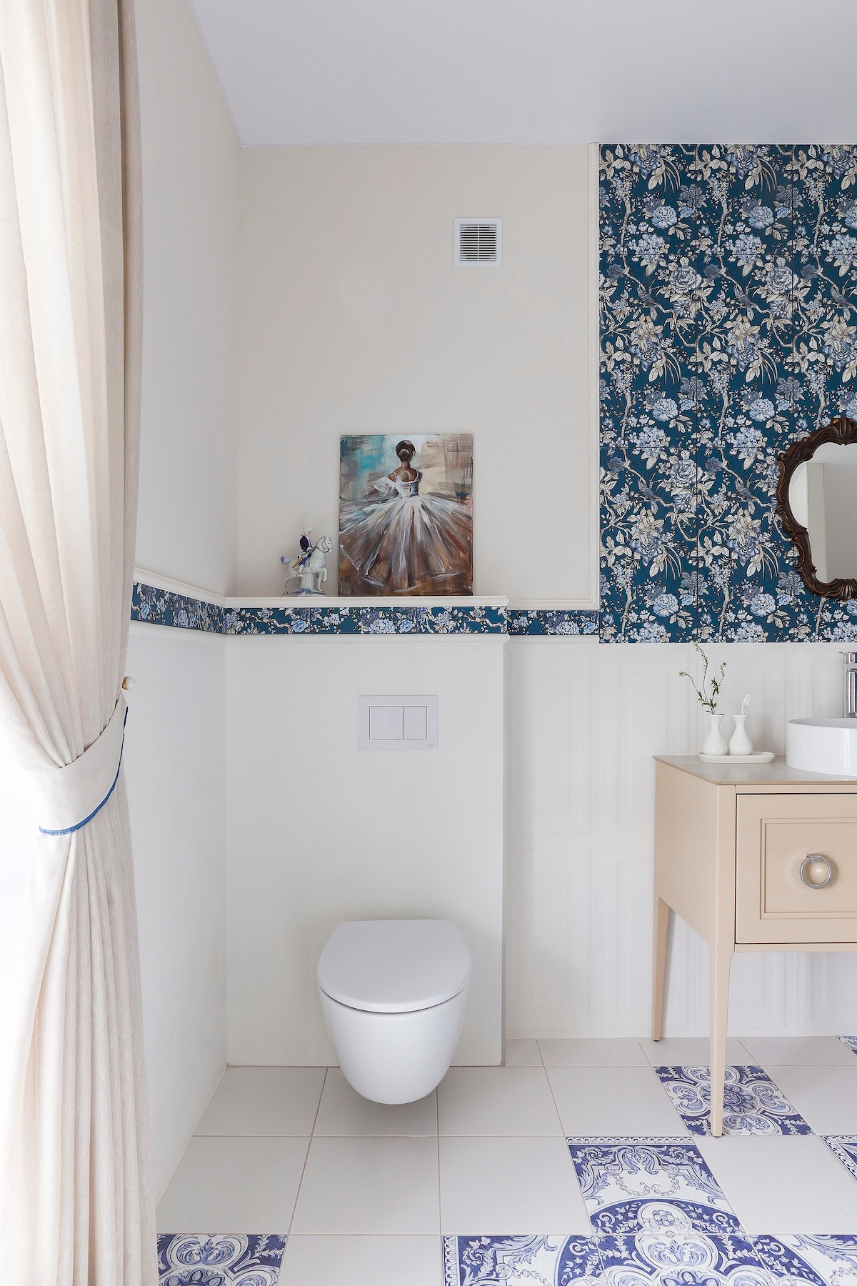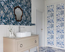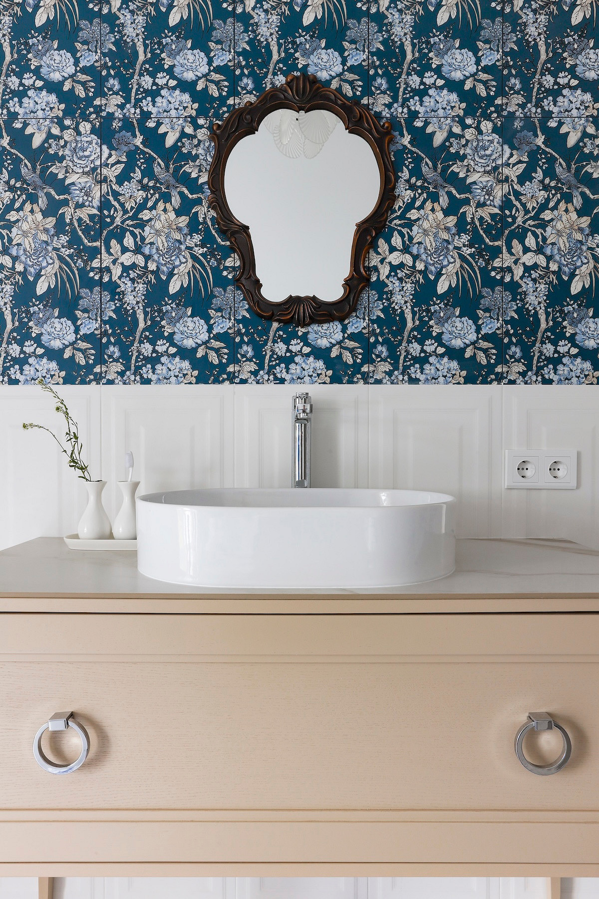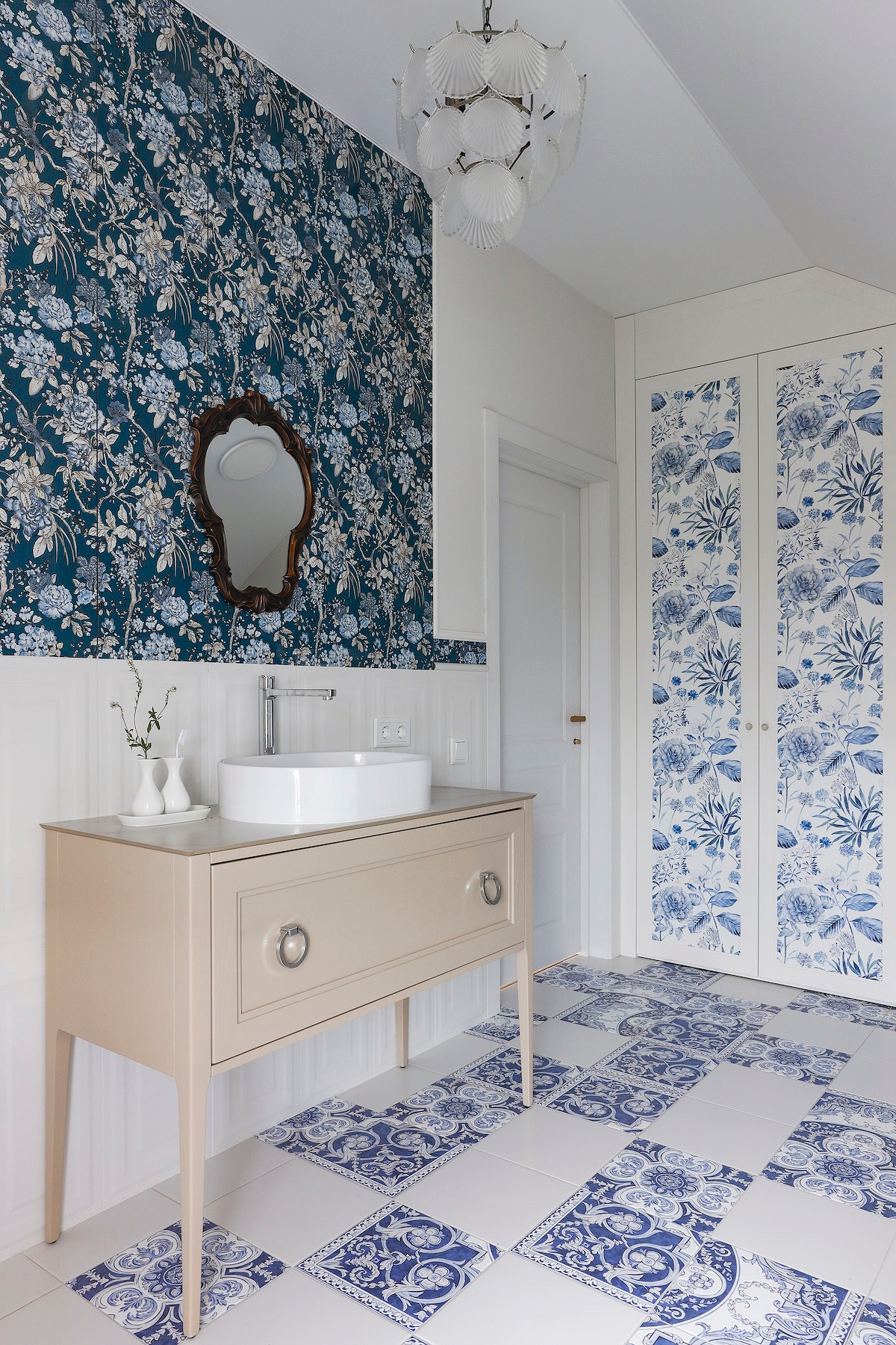 В ванной комнате сочетали несколько видов отделки: то же панно на синем фоне на акцентной стене над тумбой с раковиной, панно с тем же рисунком, но на светлом воне — в зоне ванны. Их скомбинировали со светлой плиткой в виде панелей. На полу белую квадратную плитку сочетали с декоративной.