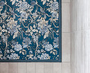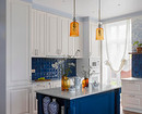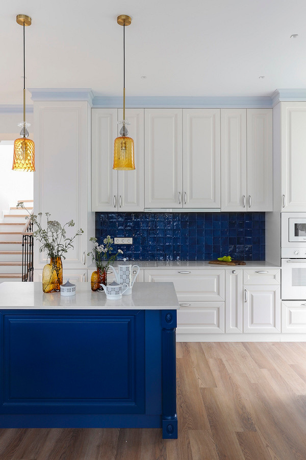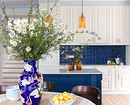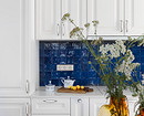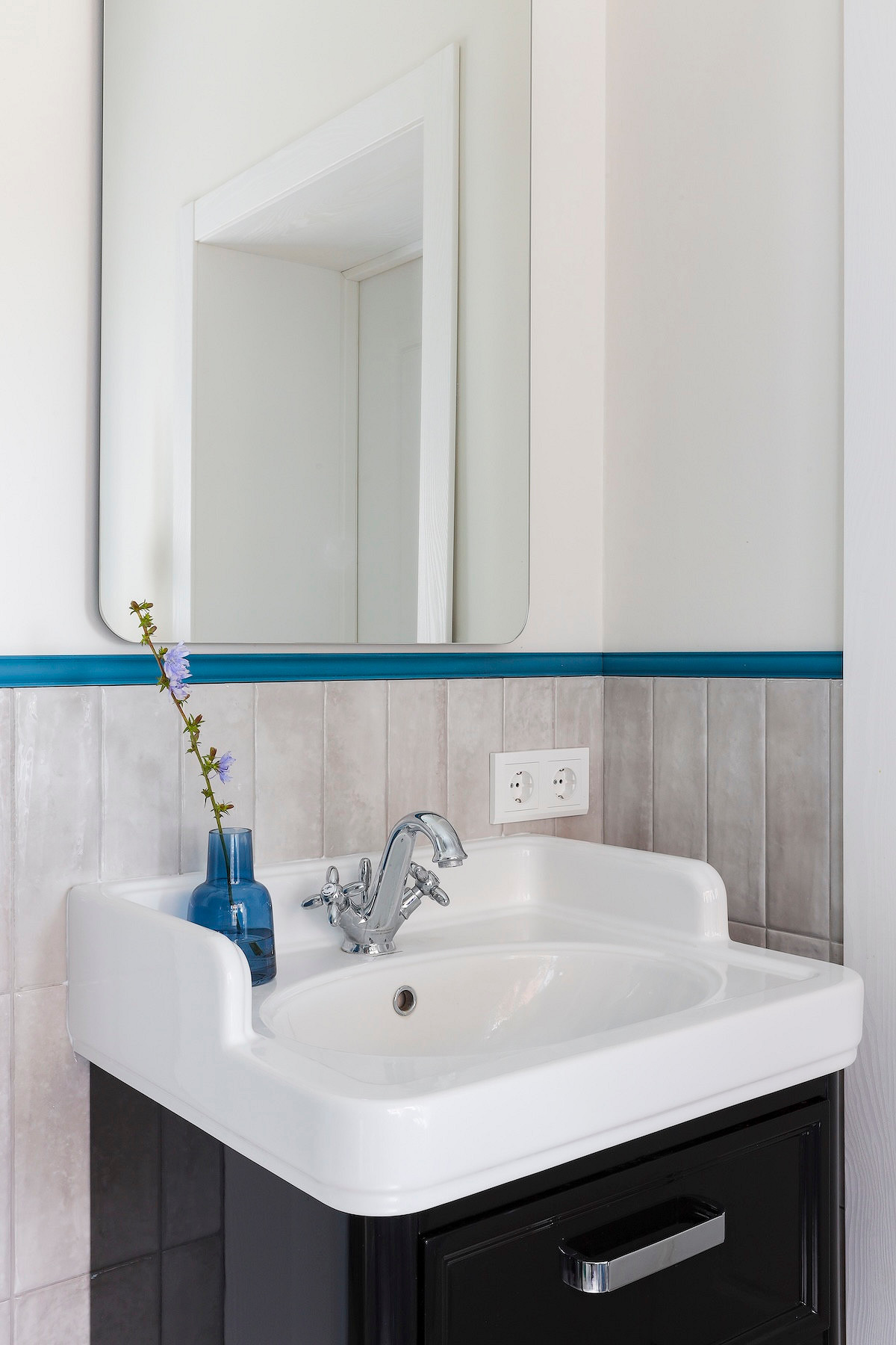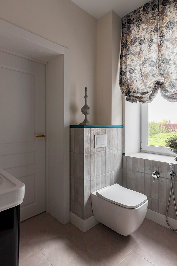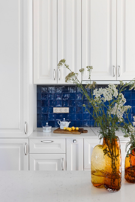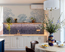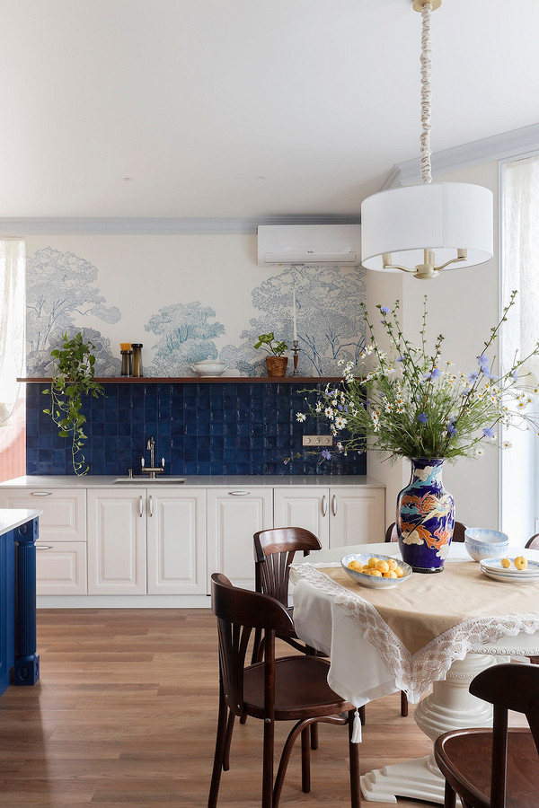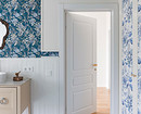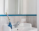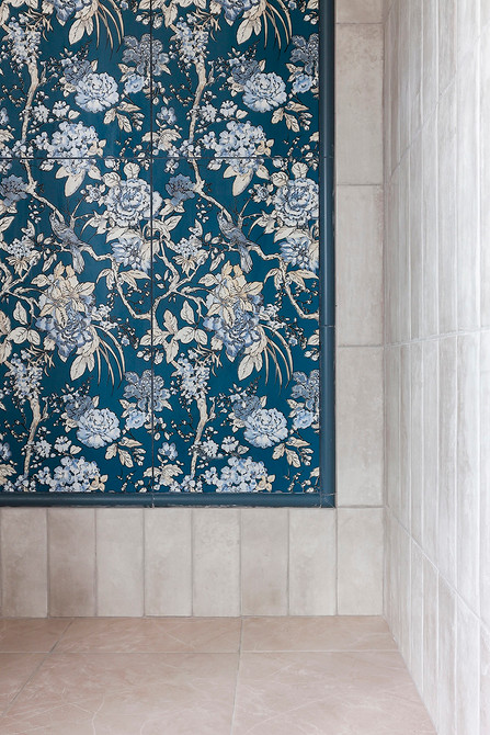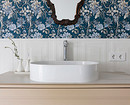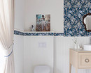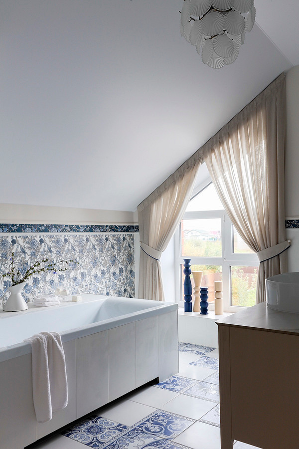 В ванной комнате сочетали несколько видов отделки: то же панно на синем фоне на акцентной стене над тумбой с раковиной, панно с тем же рисунком, но на светлом воне — в зоне ванны. Их скомбинировали со светлой плиткой в виде панелей. На полу белую квадратную плитку сочетали с декоративной.