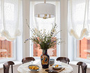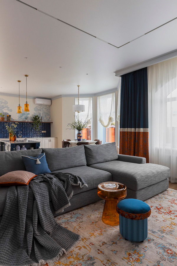 В доме продумано общее освещение в виде точечных светильников и треков, но основное внимание дизайнер уделила подбору декоративных светильников — люстр, подвесов, бра. Над островом разместили стеклянные подвесы медового цвета в поддержку оранжевому цвету штор и столиков у дивана, над кухонным столом — люстра с тканевым абажуром теплого белого цвета; в спальне голубой абажур отлично сочетается с цветом обоев, а в ванной комнате «ракушки» на люстре напоминают о морской тематике.