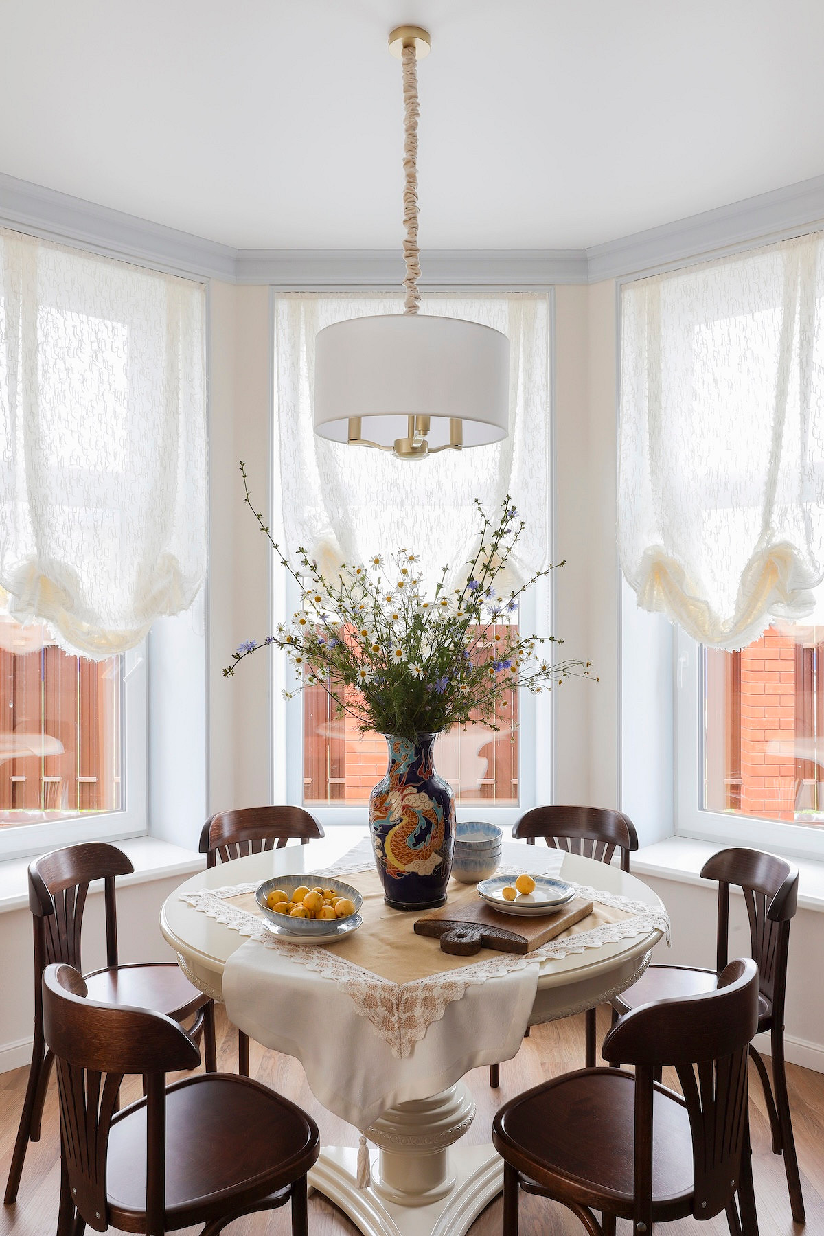 В центре кухни стоит остров, а у эркерного окна — обеденный стол с венскими стульями в винтажном стиле.