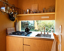 Внутри есть спальня с кроватью, которую можно убрать в пол, кухня со столовой-гостиной и душевая с санузлом. На случай холодной погоды установлен дровяной камин.