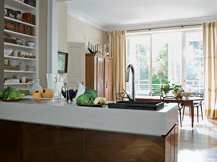 Однорычажные смесители Axor Starck с высоким поворотным изливом и смесители на два отверстия Axor Citterio M можно устанавливать на мойку с одной или двумя чашами, рядом с мойкой либо монтировать на стену. Смесители способны обеспечивать подачу воды в режиме душа и подходят как для ополаскивания овощей, так и для мытья больших кастрюль и сковород. Новинка компании - настенный смеситель Axor Uno2 - позволяет сэкономить пространство над столешницей. Его излив легко выдвигается и поворачивается. Рычаг смесителя может быть установлен и слева, и справа. Среди новых устройств выделяется модель с электронным управлением из серии PuraVida. Этот смеситель идеально вписывается в современный интерьер и радует своей функциональностью. Температуру и напор воды можно регулировать одним нажатием или поворотом рукоятки. LED-индикатор, расположенный по периметру рукоятки, отображает температуру, меняя цвет с синего на красный. Возможны предварительная настройка и сохранение показателей напора и температуры воды. Смеситель PuraVida дополнительно представлен в двух вариантах -