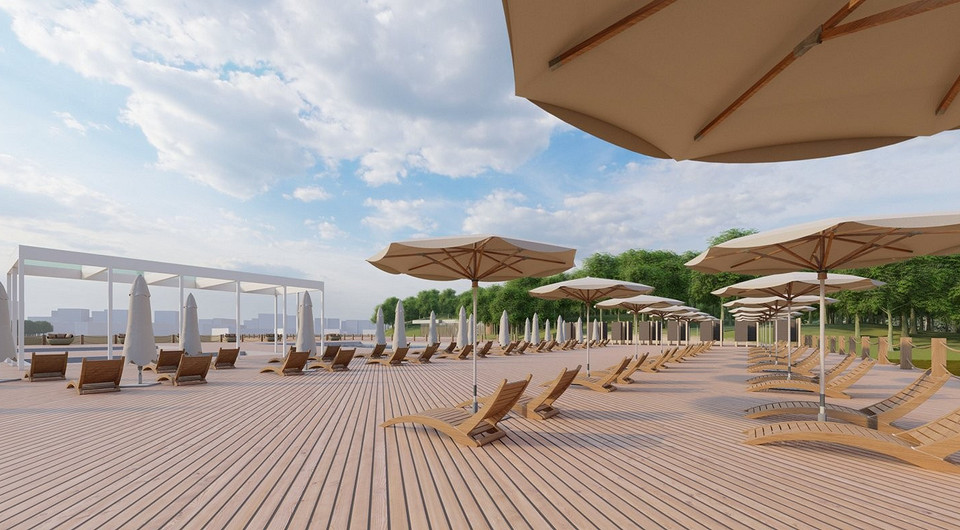 Пляжная зона с бассейнами будет расположена выше уровня воды в водохранилище. Ее планируют выложить террасными досками. Пляж будет рассчитан на 200 человек: на нем расставят более 100 лежаков и 6 пляжных диванов. Рядом обустроят пункт выдачи полотенец, душевые и раздевалки, оборудованные кассовыми ячейками. На улице тоже сделают раздевалки и открытые душевые. Также построят кафе, рассчитанное на 130 мест, и поставят кассовый павильон. Зона отдыха будет открыта только летом.