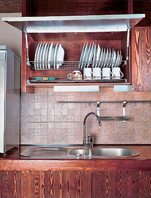Кухонная полка открывается как автомобильный багажник- на двух пневматических кронштейнах. Над мойкой- лампы с брызгозащитным экраном