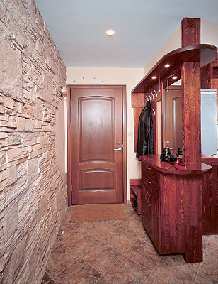Мебель для прихожей изготавливали по авторскому эскизу. Пол отделан плиткой под дикий камень. Аоб оформлении стены хозяин говорит так: "Эту стену нужно было чем-то декорировать- вешать картинки, фотографии или что-то еще. Яостановился на отделке диким камнем». Дверь произведена отечественной фирмой «ГУСИ»
