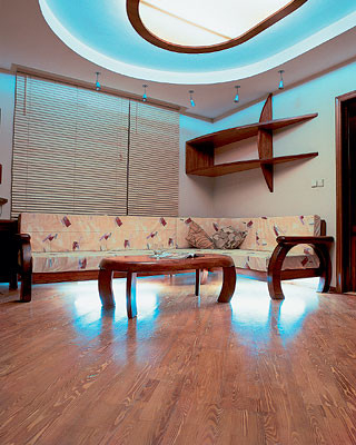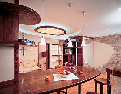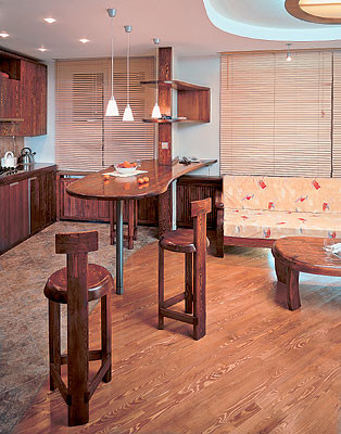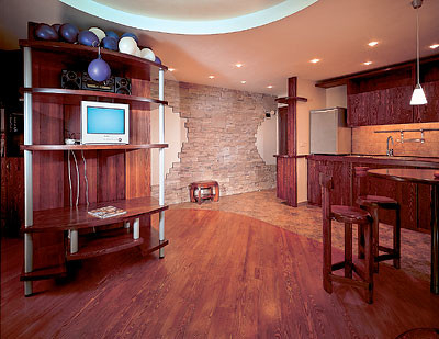 К дну углового дивана прикреплены лампы слабого накаливания. Эта скрытая подсветка очень эффектна по вечерам, при погашенном верхнем свете. Тогда еще более живописно переливается рисунок древесных волокон лиственничного пола. А гнутым формам мебели вторит эллиптическая рама потолочного светильника