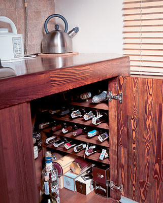Донышки бутылок в этом "погребке" касаются самой холодной стены- той, что граничит с улицей. Углы кухонного стола аккуратно закруглены и отшлифованы. Столешница и дверца сделаны из клееного массива лиственницы, внутренние полки- из ламинированной ДСП