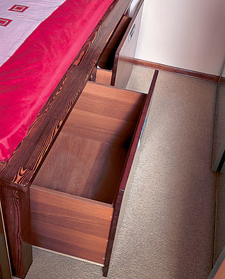 Под высокой кроватью в спальне- несколько больших и очень вместительных ящиков, на колесиках и без. Эти ящики и два просторных шкафа (в спальне и гостиной) составляют единую систему для хранения вещей