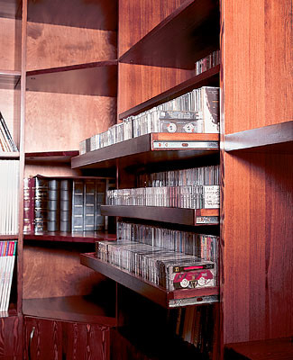 В большом шкафу, что стоит у длинной стены гостиной, устроены полки для домашней библиотеки, которая скоро "переедет" сюда из старой квартиры. Вспециально сконструированных выдвижных деревянных кассетах достаточно места для богатой коллекции музыкальных записей