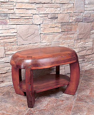 Эту крепенькую банкетку на толстых упругих ножках тоже выполнили по эскизам хозяина, вырезали из лиственничных мебельных плит и собрали на клею, без единой металлической детали
