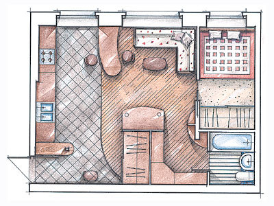 Округлость практически всех деталей интерьера, конструкций потолка и границы укладки керамической плитки, сочетаясь с четкими диагоналями палубной укладки паркетной доски, придает небольшому пространству пластичность и динамику