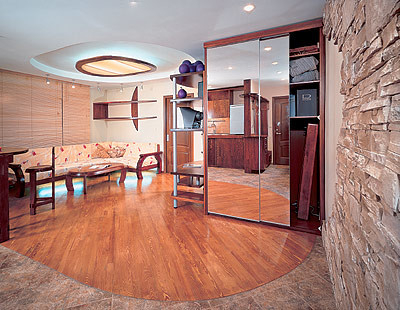 Из прихожей просматривается вся центральная зона гостиной и барная стойка. Если зеркальные двери-купе закрыты, в них «достраиваются» до полного круга полукруг паркета и полукруг «каменной» облицовки на стене прихожей