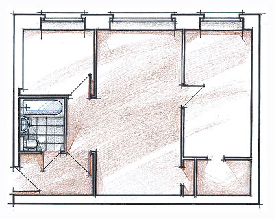 к нему столешницу. Теперь закругленные формы этой столешницы, полок с овальным светильником и плафона связаны единым мотивом эллипса