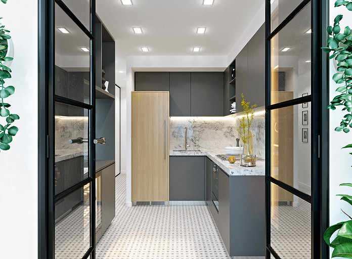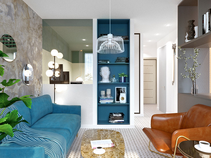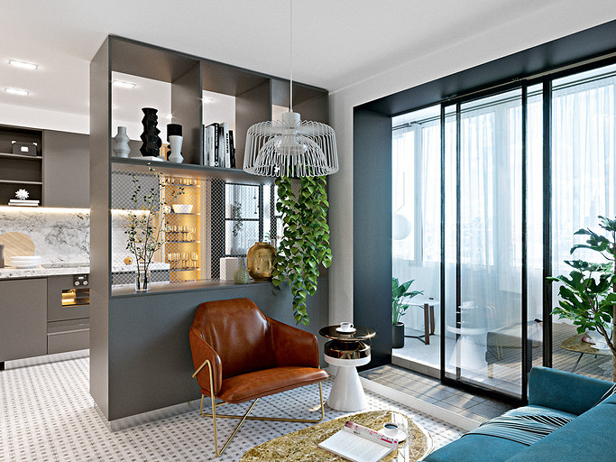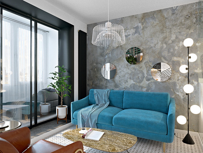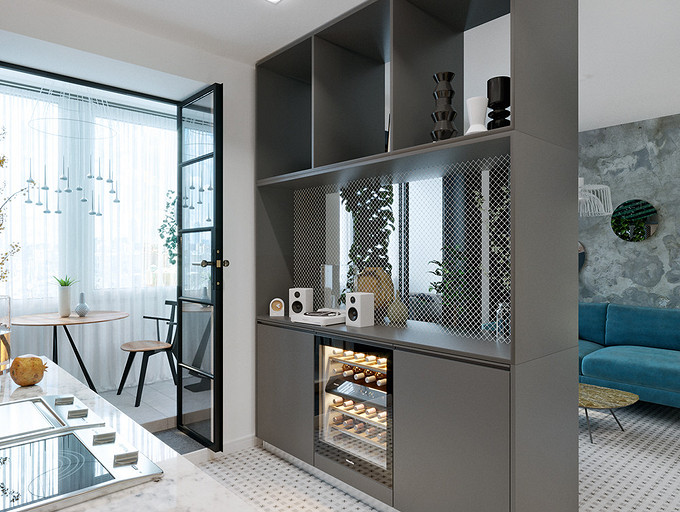 Дизайнер меняет местоположение перегородок и конфигурацию помещений, утепляет лоджию и упрощает к ней доступ. Благодаря этому, в маленькой однушке появляются студийное пространство, спальня, удобные прихожая и санузел, мини-столовая и зона отдыха. Эстетика оформления — современная, с элементами брутализма.