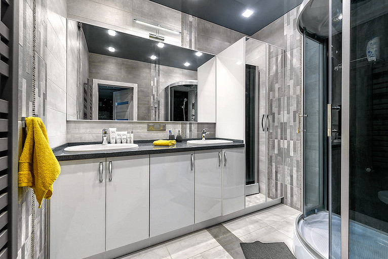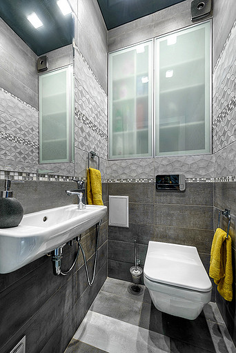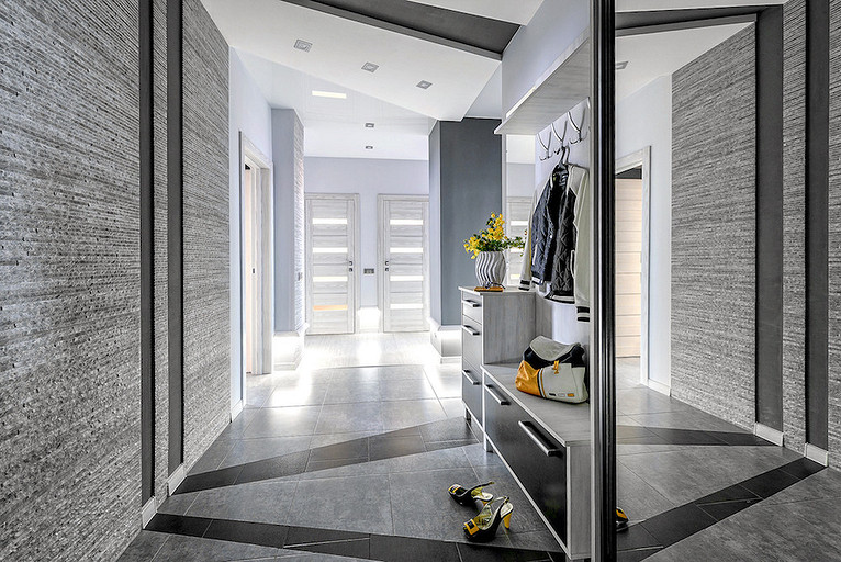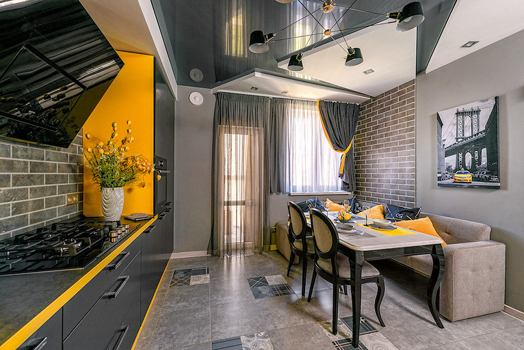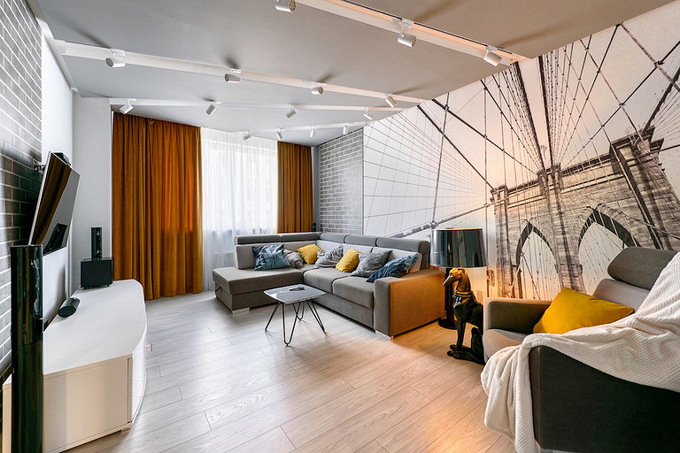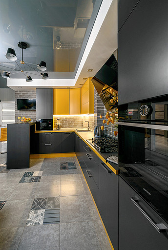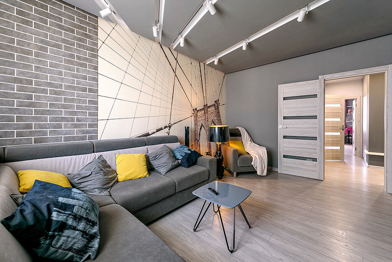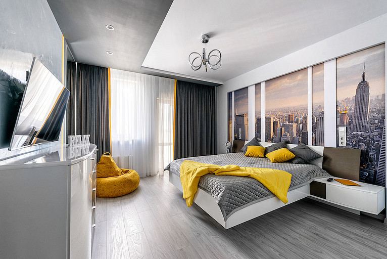 Интерьер этой калининградской квартиры кажется ахроматичным. Но благодаря вкраплениям жёлтого и подсветкам, по чёрным, белым и серым поверхностям словно разбегаются лучи солнца, и интерьер светлеет, как небо в лучах рассвета. Резкие диагонали, головокружительные фотопанорамы меняют масштабы помещений.