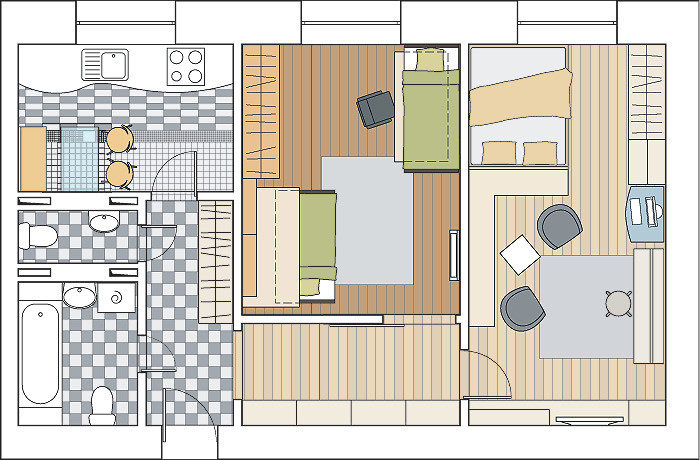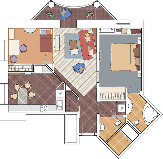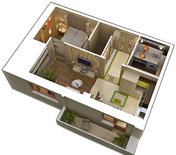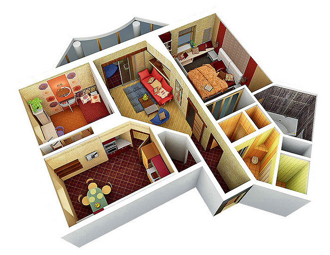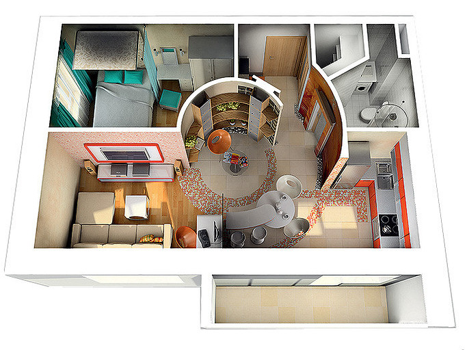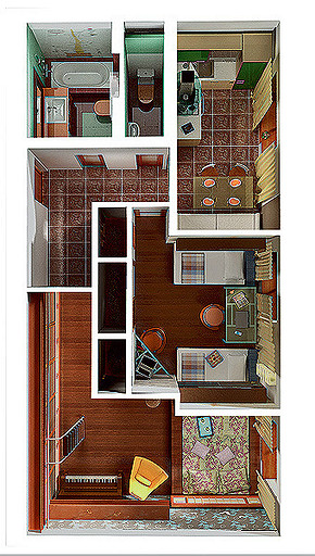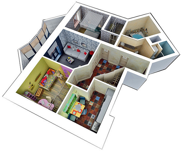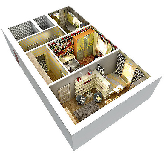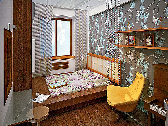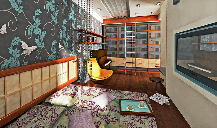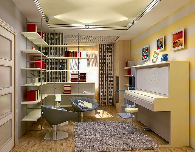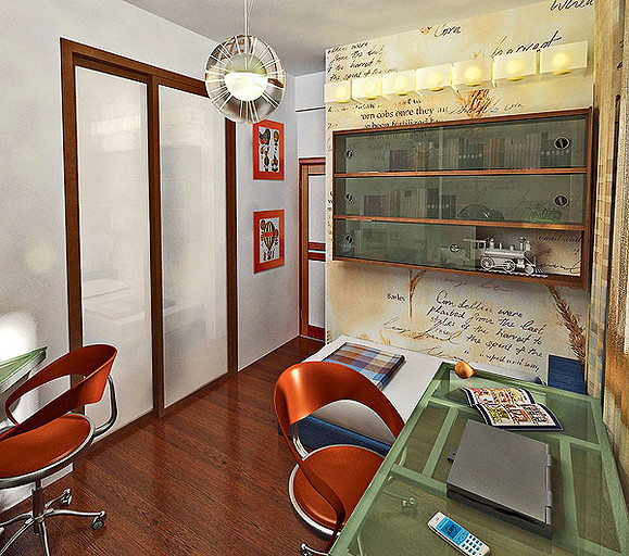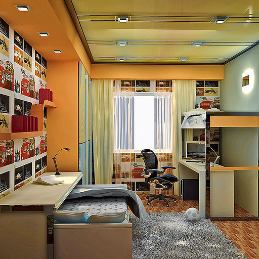 Детскую меблируют двумя трансформируемыми модулями: рабочее место- кровать. Это наиболее многоцветная комната в квартире- за счет аппликации, составленной из иллюстраций, вырезанных из комиксов