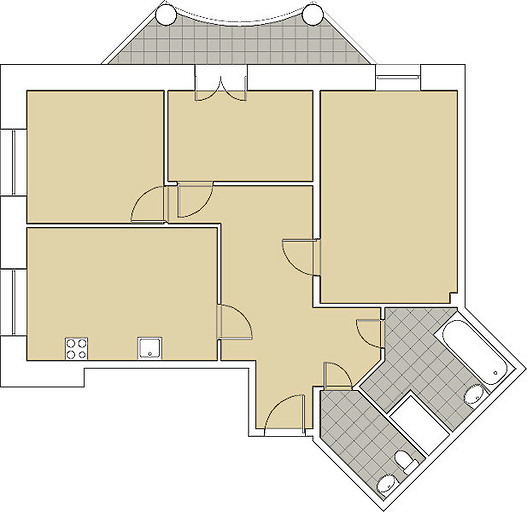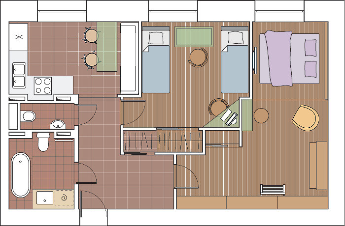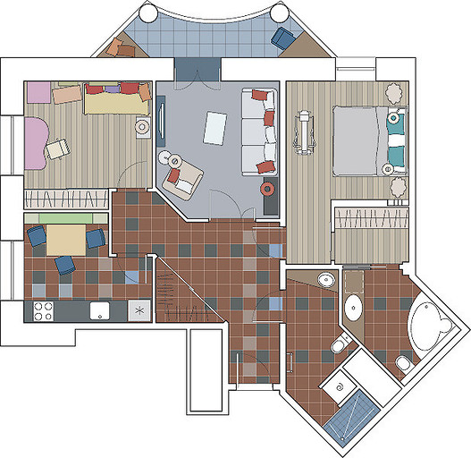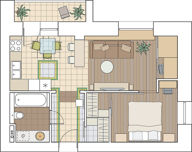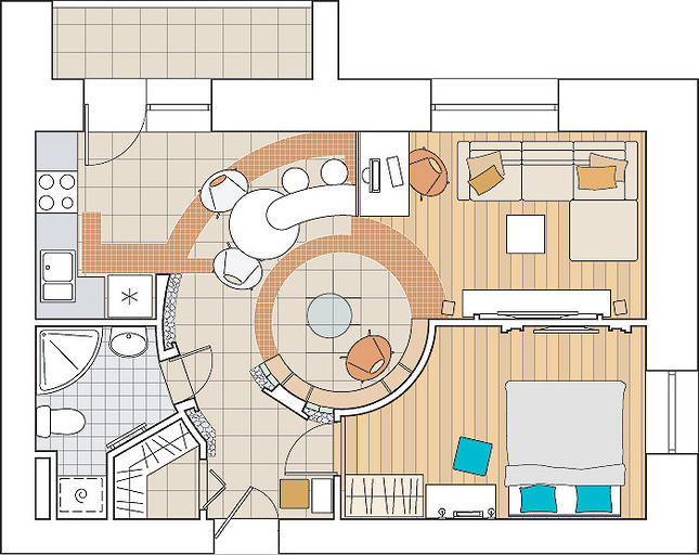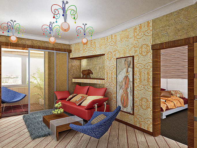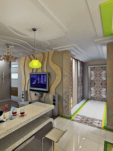 Вид на гостиную открывается через портал, образованный "колоннами" (их базой служит деревянный плинтус, а капителью- ступенчатый выступ на потолке), которые расписаны "золотыми" узорами. На полу композиция поддержана полосками мозаики, а между колоннами- эффектное панно