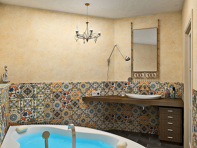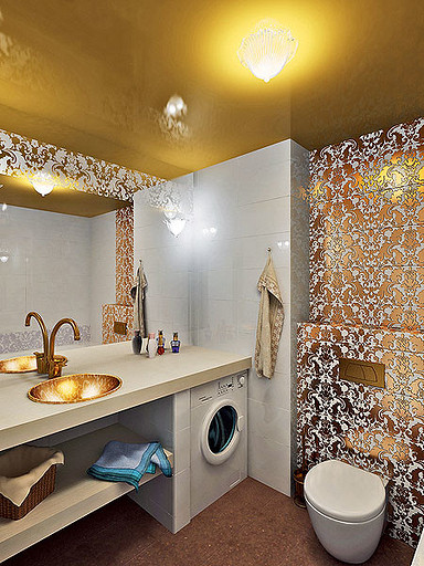 Благодаря плитке с "золотым" орнаментом ванная выглядит как блестящий сад. Светильники из муранского стекла в виде полураскрытых цветов и раковина с нежными растительными узорами усиливают общее впечатление изысканности. Последний штрих- «золотой» натяжной потолок