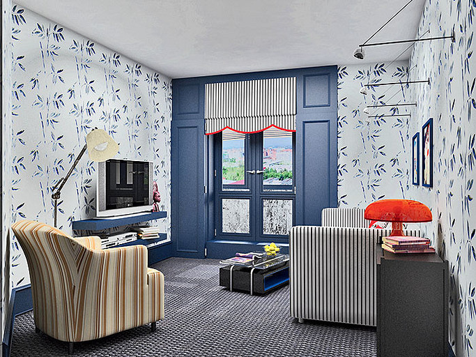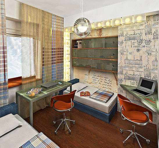 В оформлении комнаты двух мальчиков присутствуют элементы постмодернизма. Помещение носит "мужской" характер и рассчитано "на вырост". Все внимание сосредоточено на чистых формах (каркас стола, стеллажи, рисунок на шторе) и графических линиях: обои Happy Days (York Wallcoverings), светильники из стекла
