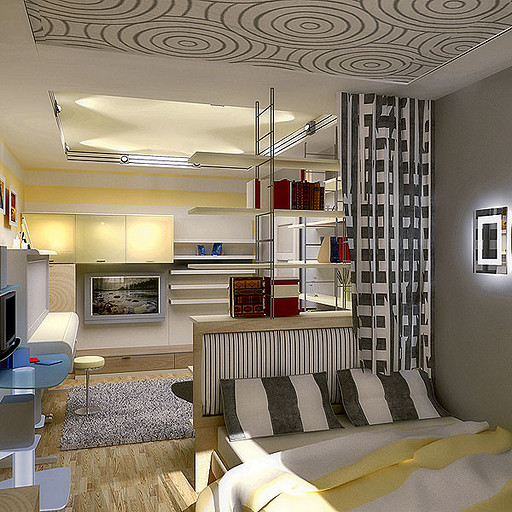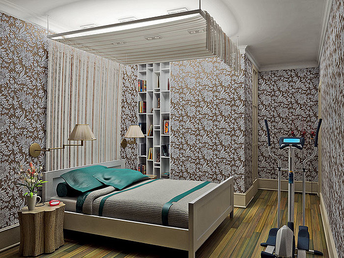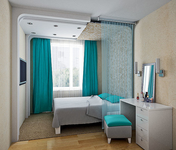 В спальне выделяют входную зону с платяным шкафом и туалетным столиком, а также спальное место. Оно специально подчеркнуто понижением подшивного потолка, который плавно загибается на стену, где размещен телевизор. Другая часть изгиба- в изголовье кровати- оформлена тканевыми обоями. Ложе отделено полупрозрачной драпировкой