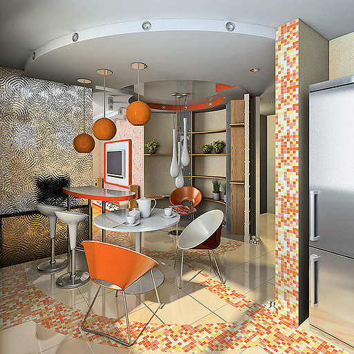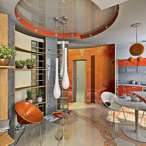 Участок на потолке с глянцевым натяжным полотном зрительно увеличивает высоту помещения. Светильники- оранжевые шары-"тыквы" и молочно-белые "капли"- кажутся природными объектами. Благодаря стеклоблокам в прихожую попадает больше света