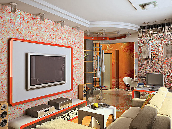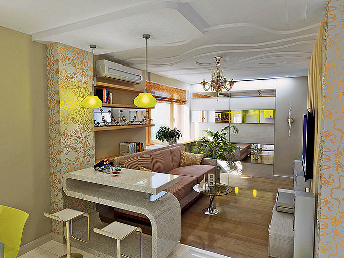 Интерьер оформлен в современной стилистике с легкой примесью ар деко