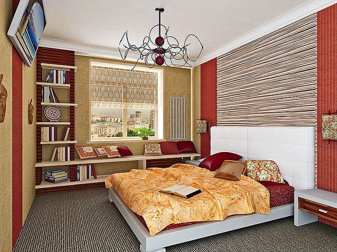 Обстановка спальни достаточно лаконична- прямые линии, простые формы. Живописной ее делает разнообразие цветовой гаммы